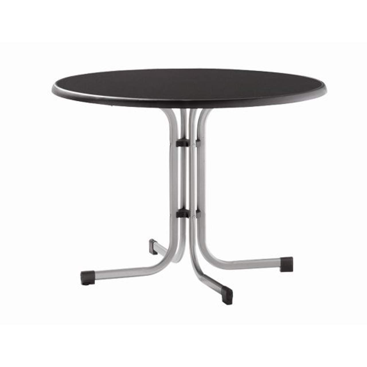 Sieger 236/A Boulevard-Klapptisch mit mecalit-Pro-Platte Ø 100 cmDer Sieger Klapptisch Boulevard ist ein kleiner runder Gartentisch für den universellen Gebrauch im Außenbereich. Der Tisch punktet besonders mit seinen kleinen Abmessungen und findet fast auf jedem Balkon oder in jedem kleinen Garten Platz. Aufgrund der schlichten Gestaltung lässt sich der Gartentisch auch hervorragend mit anderen Gartenmöbeln kombinieren und ist somit flexibel einsetzbar.Egal ob als Beistelltisch zu einer Gartenlounge, als Buffettisch beim Grillabend oder als Tisch auf dem Balkon - der Klapptisch ist ein echter Alleskönner. Praktische Klappfunktion Durch die praktische Klappfunktion nach Boulevard-Prinzip überzeugt der Tisch mit einer einfachen Handhabung. Im Handumdrehen kann er einfach auf- und abgebaut werden und ist immer dann einsatzbereit, wenn man ihn braucht.Bei Nichtgebrauch kann er einfach platzsparend verstaut werden. Robuster Beistelltisch Die Tischplatte in Anthrazit ist aus Original Mecalit-Pro gefertigt und verfügt über einen eisengrauen Strukturrand, der eine formstabile und stoßfeste Kante erzeugt. Die Tischoberfläche aus Melamin hat ähnliche Eigenschaften wie die einer Küchenarbeitsplatte und ist somit strapazierfähig und zugleich pflegeleicht.Dank des Materials ist der Gartentisch dauerhaft wetterfest und für den permanenten Aufenthalt im Außenbereich geeignet. Das robuste Material macht ihn hitze- und kältebeständig und somit witterungsfest gegen Regen, Frost und starke Sonneneinstrahlung. Boulevard-Gestell mit Höhenausgleich Der Tisch hat eine Höhe von 72 cm und verfügt an den Füßen über einen Höhenausgleich, sodass der Tisch an unebene Untergründe angepasst werden kann und nicht wackelt.Das graphitfarbene Boulevard-Gestell ist aus Stahl-Flachovalrohr (Rohrstärke 35 mmx 20 mm) gefertigt und polyesterbeschichtet. Dadurch ist es unempfindlich gegen Witterungseinflüsse und hält den härtesten Anforderungen im Außenbereich stand. Der Tisch wird montagefrei geliefert und ist somit sofort einsatzbereit.Der Tisch ist TÜV Süd-geprüft (Produktion überwacht, Sicherheit geprüft)