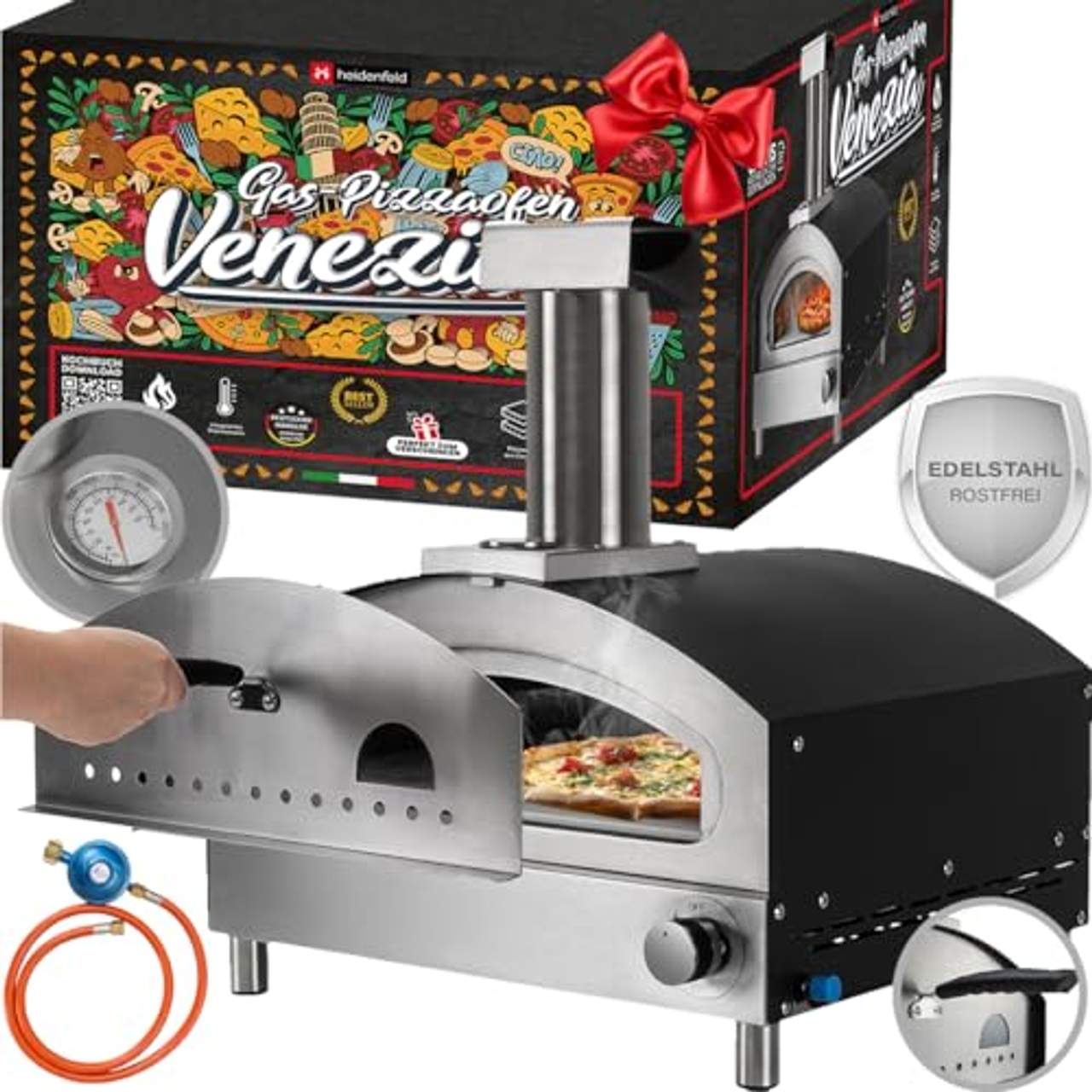 Heidenfeld Gas Pizzaofen VeneziaOriginal Heidenfeld Deutscher Händler Heidenfeld Gas-Pizzaofen Venezia Die Pizzeria im eigenen Garten Egal ob allein, mit der Familie oder Freunden ? genießen Sie mit dem Heidenfeld Gas-Pizzaofen Venezia leckere Pizza ganz bequem zuhause! Mit seinen kompakten Abmessungen findet der er sicher seinen Platz in Ihrem Garten, auf dem Balkon oder der Terrasse. Kulinarisch ist die Pizza aus dem Gas-Pizzaofen definitiv ein echtes Highlight.Aber auch in Sachen Funktionalität und Handhabung ist der Outdoor-Pizzaofen erste Klasse. Die Zubereitung geht kinderleicht und blitzschnell. Die hohe Temperatur von bis zu 500° liefert lecker knusprige Pizza in nur wenigen Minuten. Durch den Gasbetrieb ist kein langes Anschüren nötig.Das Gehäuse aus hochwertigem Edelstahl hält die Hitze konstant im Ofen. Und der mitgelieferte Pizzastein aus Cordierit sorgt für das Gelingen Ihres Menüs. Mit dem Heidenfeld Gas-Pizzaofen Venezia wird Ihre nächste Gartenparty garantiert der Hit ! Integriertes Thermometer,