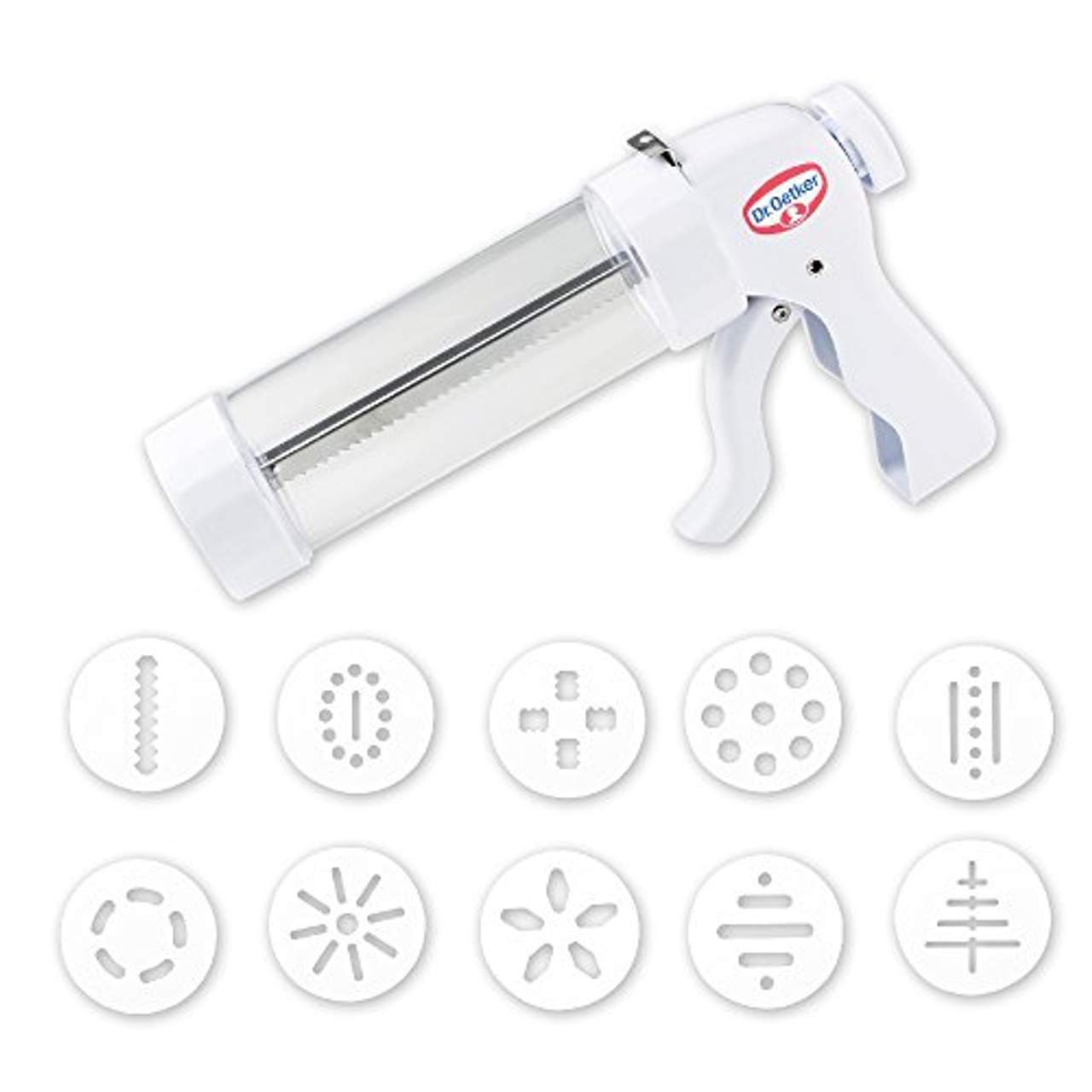 Dr Oetker GebäckpresseFrisch aus der Plätzchenbäckerei: feinstes Spritz-Gebäck. Kommt mit dieser Plätzchenpistole von Dr. Oetker in den unterschiedlichsten Formen aus dem Backofen. Die 10 wechselbaren Form-Aufsätze garantieren eine optische Abwechslung auf dem Plätzchenteller und lassen identisch grosse Kekse mit nur einer Hand aus der Tube drücken.Das praktische Kunststoff-Material ist zuverlässig und äusserst leicht zu reinigen. Dieses Gebäckpresse-Set darf in keiner Plätzchenbäckerei fehlen.