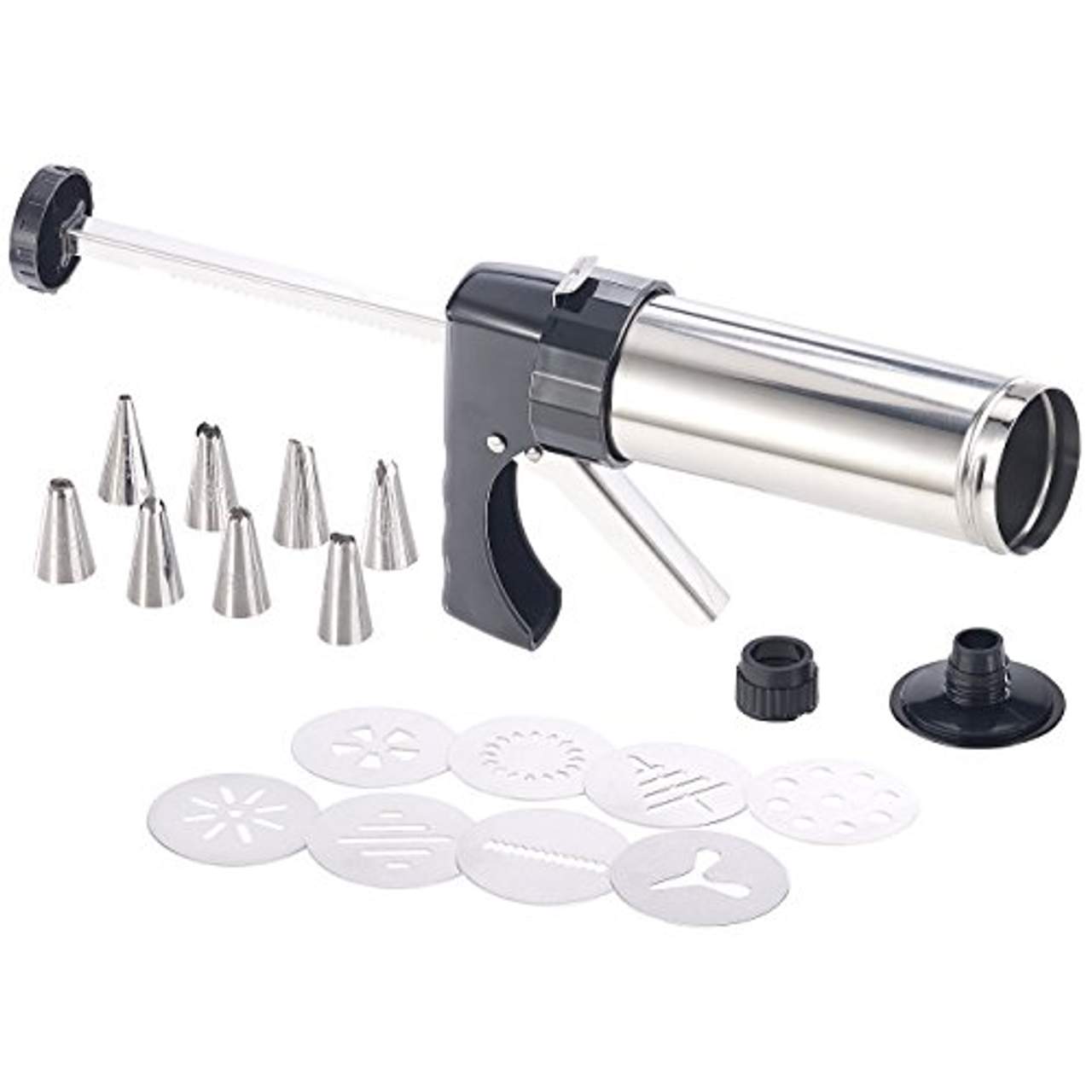 Neben der Gebäckpresse enthält das Paket acht austauschbare Aluminiumschablonen, die eine Vielzahl von Gebäckformen ermöglichen. Außerdem erhältst du acht Spritzdüsen aus Edelstahl in verschiedenen Formen und Größen. Dieses Zubehör bietet unendlich viele Möglichkeiten für Kreativität in der Küche.