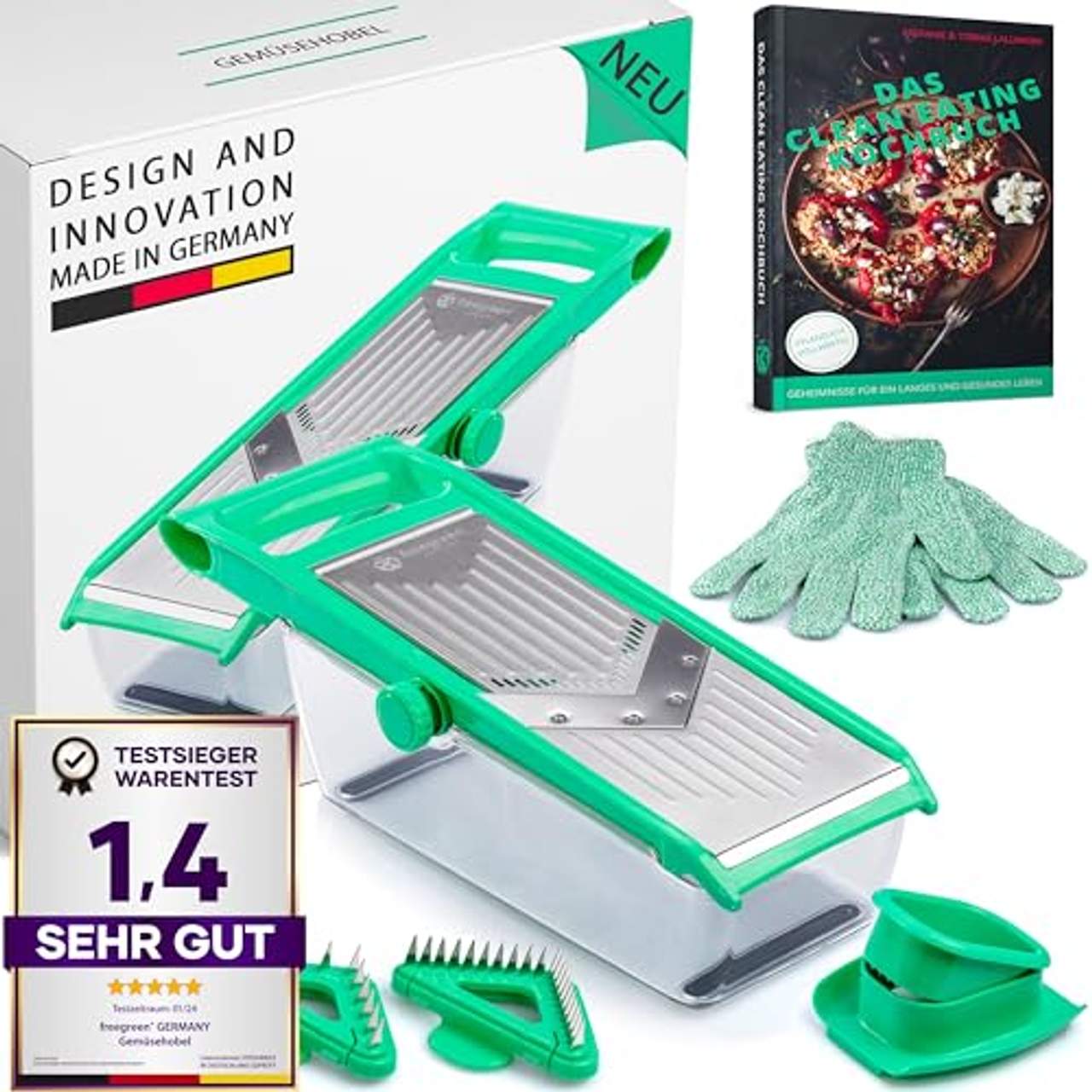 freegreen Premium Obst- & Gemüsehobel aus Edelstahlfreegreen Premium Obst- &, Gemüsehobel aus Edelstahl mit V-Klinge und Gemüsehalter für perfekte Obst- &, Gemüsescheiben sowie Juliennestreifen – „Universell einsetzbar und zeitsparend schneiden, raspeln, hobeln, würfeln oder stifteln von Obst, Gemüse, Früchte, Kräuter und Nüsse! Inklusive Kochbuch „DAS CLEAN EATING KOCHBUCH - GEHEIMNISSE FÜR EIN LANGES UND GESUNDES LEBEN“ Du isst auch immer nur zwischendurch, hast aber Lust auf einen gesunden Gemüseauflauf? Kartoffeln, Karotten, Paprika, Zucchini, Zwiebeln und Kohlrabi sind schon eingekauft, jetzt geht es ans Zerkleinern.Eine lästige Arbeit, die Du mit Deinem neuen Gemüsehobel aber einfach schnell erledigst. Schon nach kurzer Zeit schichtest Du die Scheiben und Würfel in die Auflaufform, gibst die Soße und den Käse dazu – und ab in den Ofen. Bist auch Du genau deshalb auf der Suche nach einem hochwertigen Gemüsehobel, der Dich dabei unterstützt, schnell eine köstliche Mahlzeit zu kreieren? Dann präsentiert Dir freegreen ab sofort die optimale Lösung!Deine Vorteile auf einen Blick: Edelstahl Gemüsehobel mit Auffangbehälter und RestehalterHochwertige 304 Edelstahlklingen für perfekte SchneidergebnisseZu 100% präzise, effizient, zuverlässig, bruchsicher und langlebigKraftsparend dank hochwertiger Riffelform der MetallflächeSpülmaschinengeeignet [Ausnahmslos alle Teile]Verhüllt in einer edlen GeschenkverpackungPremium Qualität aus dem Hause freegreen Klicke jetzt auf in den Warenkorb und sichere Dir den innovativen Gemüsehobel von freegreen!