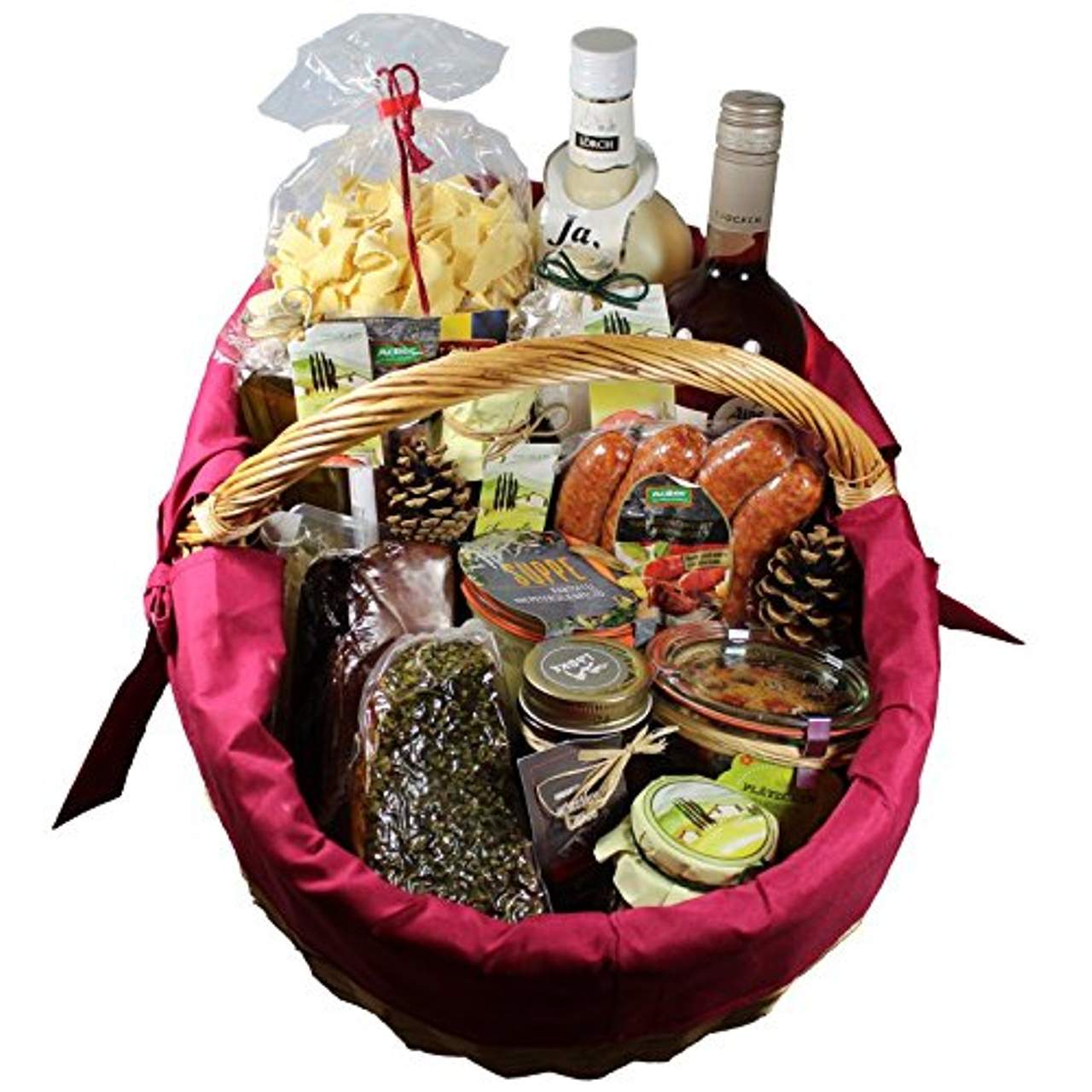 SchwarzwaldArt Lebensmittel-Präsentkorb"Riesige Auswahl" mit schwarzwälder SpezialitätenMit unserem Präsentkorb „Riesige Auswahl“ haben Sie sich für ein prachtvoll gefüllten Geschenkkorb entschieden welcher eine Augenweide für alle Feinschmecker und Jubiläre darstellt. Das Set besteht aus einem praktischen Weidenkorb mit roter Textileinlage, gefüllt mit: kernig-bissigen Gourmet-Landjäger, 1 Paar (80g) (Mindeste Haltbarkeit: 30 Tage) deftigen Hochschwarzwälder Bauernwurst, 1 Pack = 4 Würste a 100g, (Mindeste Haltbarkeit: 30 Tage) Original Adler Schwarzwälder Schinken, 500g (Mindeste Haltbarkeit: 30 Tage) edlem Bergkräuterschinken, mindestens 400g (Mindeste Haltbarkeit: 25 Tage) köstlich-cremiger Kartoffelsuppe mit Petersilienpesto, 370g (Mindeste Haltbarkeit: 100 Tage) herzhaft tomatigem Sugo alla Arrabiata, 250ml (Mindeste Haltbarkeit:100 Tage) Whiskey-Sauce, rauchig-herb, 250g (Mindeste Haltbarkeit: 100 Tage) praktischem Spaghettigewürz, 50g (Mindeste Haltbarkeit: 100 Tage) edlem Natives Olivenöl, extra, 95ml (Mindeste Haltbarkeit: 100 Tage) Meersalz, 250g in einer geschwungenen Flasche (Mindeste Haltbarkeit: 100 Tage) gerädelte Bandnudeln für Ihre herliche Pasta, Premium 13mm, 500g (Mindeste Haltbarkeit:600 Tage) Bunte Cookies, dem Gaumenschmaus für die ganze Familie, 160g (Mindeste Haltbarke: 100 Tage) Schwarzwald Hochzeit, 0,7l dem köstlichen Sahne Vanille Likör aus dem Haus Bimmerle und Spätburgunder Rosé, 0,75l aus dem Hause Alde Gott.