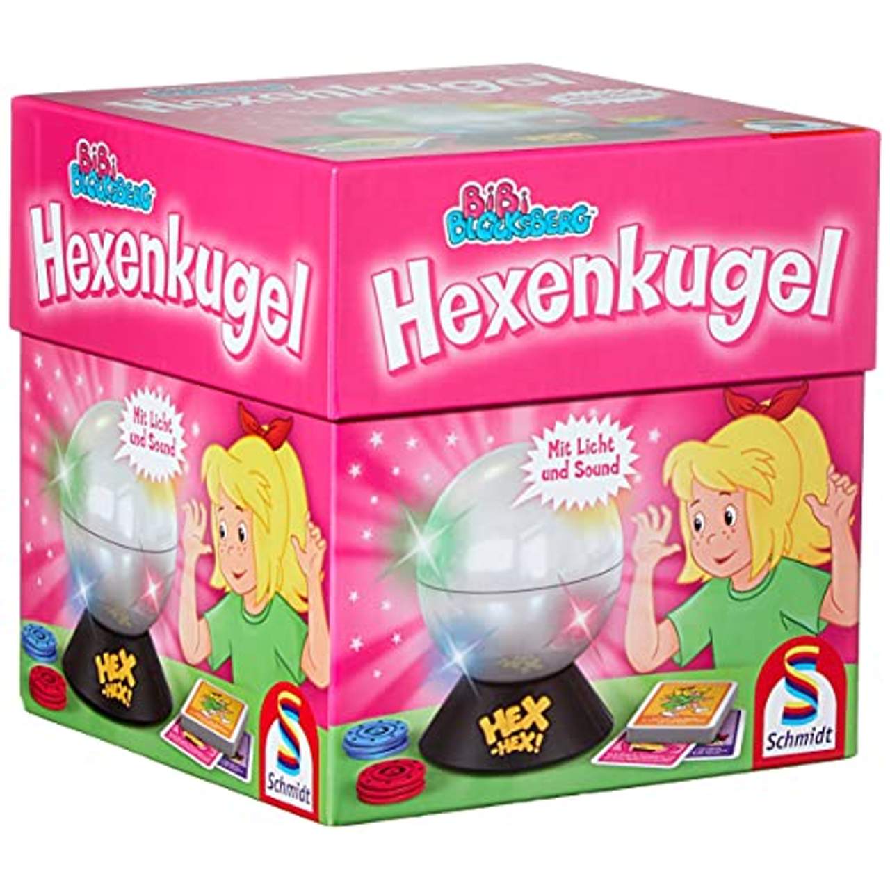 Schmidt Spiele 40458 Bibi BlocksbergHex hex! Die Hexenkugel von Schmidt Spiele verspricht Riesenspaß. Bibi und ihre Freundinnen befragen heimlich Barbaras Hexenkugel. Da diese ihre Hexenkugel mit einem Sicherungs-Hexenspruch versehen hat, erleben die Junghexen eine Überraschung und lauter verrückte Dinge passieren:Bibi watschelt im Entengang um den Tisch, Flauipaui hat zerzauste Haare und Arkadia hat plötzlich einen Elefantenrüssel. Und das Ganze passiert mit tollen Licht- und. In diesem Spiel gibt es keine Verlierer, denn hier wird gemeinsam gespielt!Um die Kugel herum liegen farbige Chips, jedoch immer einer weniger als es Mitspieler gibt. Solange die Kugel leuchtet, lassen alle Mitspieler über den Chips ihre Hände kreisen. Bleibt die Kugel bei einer Farbe stehen, müssen die Mitspieler so schnell wie möglich nach einem Chip dieser Farbe greifen.Der Mitspieler, der keinen Chip bekommen hat, zieht eine Karte vom HEX-HEX-Kartenstapel. Anschließend muss er die Aufgabe, die auf der Karte steht, erfüllen. So geht es weiter, bis alle HEX-HEX-Karten erfüllt sind. Spielspaß für alle garantiert!Details: