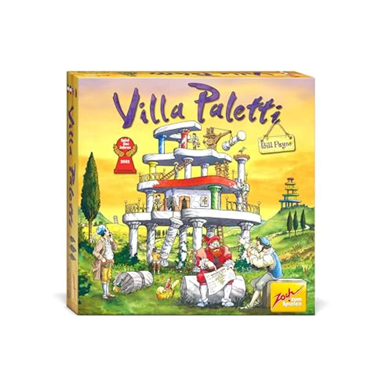 Villa Paletti, Spiel des Jahres 2002Im Land wo die Zitronen blühen lebte einst ein schrulliger, alter Kauz, den seine Freunde schlicht Paletti nannten.Der hatte nur eines im Kopf: Das prächtige Luftschloss fertig zu stellen, das sein noch schrägerer Großvater einst begonnen, aber mangels Dukaten nie vollendet hatte.Dukaten hatte Paletti zwar auch keine, dafür aber einen genialen Plan! Wozu neue Säulen kaufen, wo doch in den unteren Etagen so viele nutzlos rumstehen?! Die werden ausgebaut, höher gestellt und ganz oben wieder eingebaut! Excellente, Paletti riefen seine Freunde und machten sich ans Werk.So entstand ein waghlasiger Prachtbau: DIE VILLA PALETTI. Heute weiß leider niemand mehr, welcher Windstoß oder welches Lüftchen die Villa Paletti der Nachwelt vorenthielt. Unter Fachleuten gilt allerdings als gesichert, dass Paletti - seiner Zeit weit voraus - damals eine Erfindung gelang, deren volle Tragweite erst heute richtig eingeschätzt werden kann: Die Europalette !