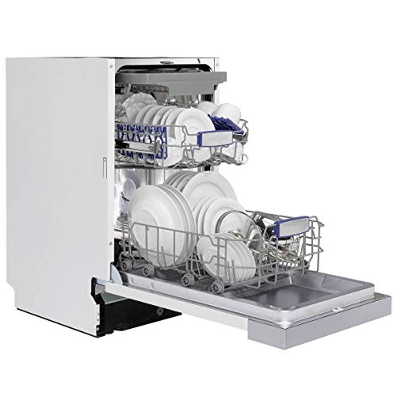 Dieser teilintegrierbare Geschirrspüler ist 45 cm breit und für 10 Gedecke geeignet. Er verfügt über eine Soft-Touch-Bedienung zur Programmwahl, verstellbare Körbe für große Gegenstände und ein Innenleben aus Edelstahl. Für zusätzliche Sicherheit sorgen die Kindersicherung und der Überlaufschutz. Außerdem zeigt die Bodenbeleuchtung an, wenn das Gerät in Betrieb ist, und schaltet sich aus, wenn es fertig ist. Der geschätzte Jahresverbrauch beträgt 211 kWh/Jahr bei einem Wasserverbrauch von 8 Litern pro Zyklus. Der Geräuschpegel liegt bei 42 dB.