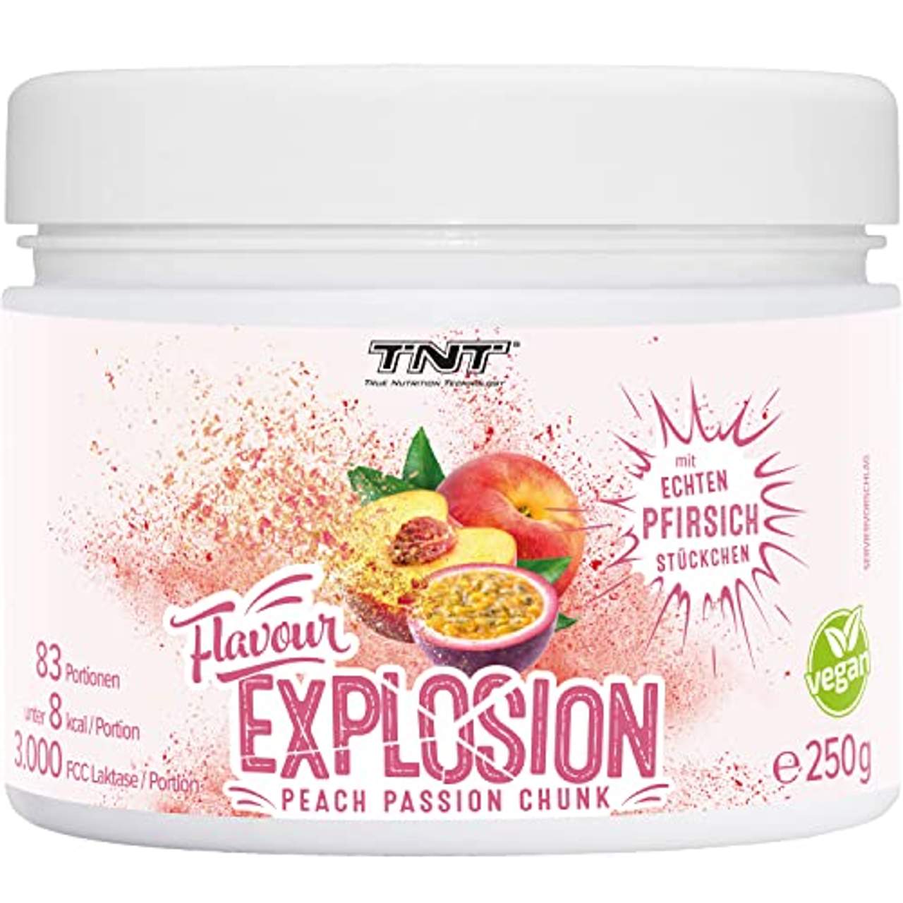 TNT Geschmackspulver Flavour Explosion Powder ist ein Geschmackspulver, das von der Marke TNT True Nutrition Technology hergestellt wird. Es ist vegan und kann zum Süßen von Speisen und Getränken mit minimalen Kalorien verwendet werden. Es gibt vier Geschmacksrichtungen: Erdbeere, Schokolade, Vanille und Pfirsich. Es enthält 3000 FCC Laktase pro Portion, die die Verdauung von Laktose verbessert, auch bei Menschen mit Laktoseintoleranz. Es kann gemischt, gerührt oder zum Aromatisieren aufgestreut werden und wird mit einem Dosierlöffel geliefert. Die Herstellung erfolgt in Deutschland unter Verwendung hochwertiger Zutaten und hat in einigen Geschmacksrichtungen zugesetzte Stücke (z.B. Schokoladenchips).