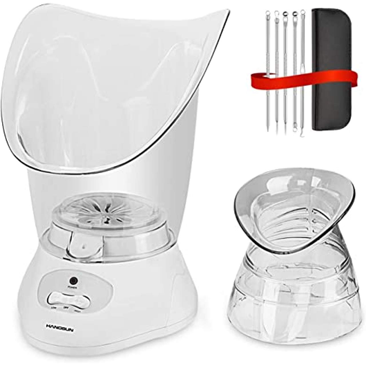 Hangsun Spa FS80Die Hangsun Gesichtssauna mit Dampfinhalator bietet alle Vorteile einer Spa Dampfbehandlung für Zuhause. Mit einer vollständigen Gesichtsmaske, nutzt die Gesichtssauna Dampf um die Poren zu öffnen, sodass Verschmutzungen entfernet werden und die Haut tiefengereinigt wird. Zwei Hitzeeinstellungen und ein anpassungsfähiges Dampfniveau bieten Ihnen eine vollständige Kontrolle.Die FS80 kann vor dem Auftragen von Makeup verwendet werden, sodass eine glattere und länger anhaltende Anwendung möglich ist. Die Tiefenreinigung hilft die Poren zu öffnen und entfernt Makeup, Schmutz und Öl von der Haut. Der FS80 Spa ermöglicht den Luxus einer Spa Behandlung Zuhause, selbst bei einem engen Zeitplan.Die FS80 Gesichtssauna ist perfekt für eine intensive Hautpflegebehandlung. Mit einem elektrischen Wärmeelement am unteren Teil der Einheit, erhitzt es das Wasser (was in einem kleinen Tank gehalten wird) auf den Siedepunkt, sodass der Dampf aufsteigt.Die Hangsun Gesichtssauna eignet sich hervorragend für die Tiefenreinigung ist auch sehr nützlich für die Befreiung der Nebenhöhlen - zudem umfasst es einen separate Inhaltoraufsatz. Statt diesen über das gesamte Gesicht zu halten, passt er nur über die Nase und den Mund. Aromatherapie Öle können auch in den Container hinzugefügt werden.Was ist in der Box:
