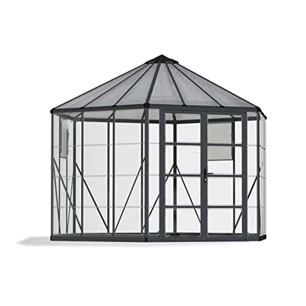 Canopia by Palram Gewächshaus gross Oasis 12 Treibhaus 316x363 cm AluminiumCanopia Oasis Hexagon Alu Gewächshaus Polycarbonat 363X316X289 cm GrauSchaffen Sie sich mit dem Palram - Canopia Oasis Gewächshaus Ihr eigenes kleines Stück vom Himmel in Ihrem Garten. Das Oasis Grünhouse Kit verfügt über ein elegantes sechseckiges Design, großzügigen Raum und ausgewogene Wachstumsbedingungen, die es zu einer komfortablen und erfolgreichen Umgebung machen, ideal für den Anbau Ihres eigenen Bio-Gartens oder die Schaffung Ihrer eigenen Oase im Hinterhof.Die doppelwandigen Polycarbonat-Dachpaneele und die kristallklaren Seitenpaneele tragen dazu bei, dass Ihre Pflanzen dank des ausgewogenen Sonnenlichts gut gedeihen.Dieses Gewächshaus für den Garten ist einfach zu installieren und verfügt über einen verzinkten Stahlsockel zur strukturellen Unterstützung, eine abschließbare Doppeltür, ein seitliches Fenster mit Lamellen zur Belüftung und ein integriertes Rinnensystem zur Wasserableitung und -sammlung.Das sechseckige Gewächshaus verbindet Form und Funktion, sowohl in Bezug auf das Design als auch auf das Material, und bietet so die nötige Flexibilität, um Ihren Bedürfnissen gerecht zu werden, ganz gleich, ob es sich um ein Gewächshaus, ein Büro oder einen geschlossenen Wohnbereich im Freien handelt.Schaffen Sie noch heute Ihre eigene Oase im Garten mit dem Oasis Grünhouse!Geräumiges, sehr widerstandsfähiges und sicheres Gewächshaus aus Polycarbonat (mit Fine Shield Technology)Kombiniert zwei Arten von Verglasungen für eine ausgewogene LichteinstrahlungBietet bis zu 100 % Schutz vor schädlichen Sonnenstrahlen (UV)Lebenslang widerstandsfähige Polycarbonat-Kunststoffwände, die im Laufe der Zeit nicht vergilben oder brechen.Das Gewächshaus hat eine verstärkte, nicht rostende, robuste Aluminiumstruktur.Die hohe Doppeltür bietet bessere Arbeitsbedingungen und leichteren Zugang.Stilvolles Gewächshaus mit sechseckigem Design, das viel Kopffreiheit und eine 360°-Rundumsicht bietetLanglebig dank der besonders widerstandsfähigen MaterialienWartungsfreier GewächshausbausatzSchützt Ihre Pflanzen vor Witterungseinflüssen, so dass Sie eine längere Wachstumsperiode genießen können.Die Gewächshäuser sind in verschiedenen Größen erhältlich.Klicken Sie hier, um weitere Gewächshaus-Bausätze zu finden.Größe: 363X316X289 cmRahmen Material: AluminiumRahmenfarbe: GrauPlattentyp: PolycarbonatPaneelverglasung: HybridDachdicke: 4.0Wandstärke: 0.7