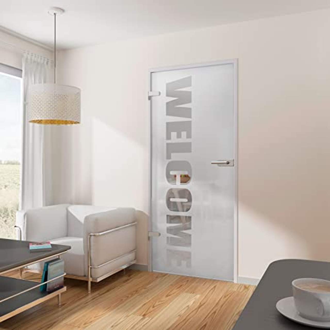 Verwandle deinen Raum mit dem inova Glastür mit Wunsch-Schriftzug satiniert weiß Komplettset