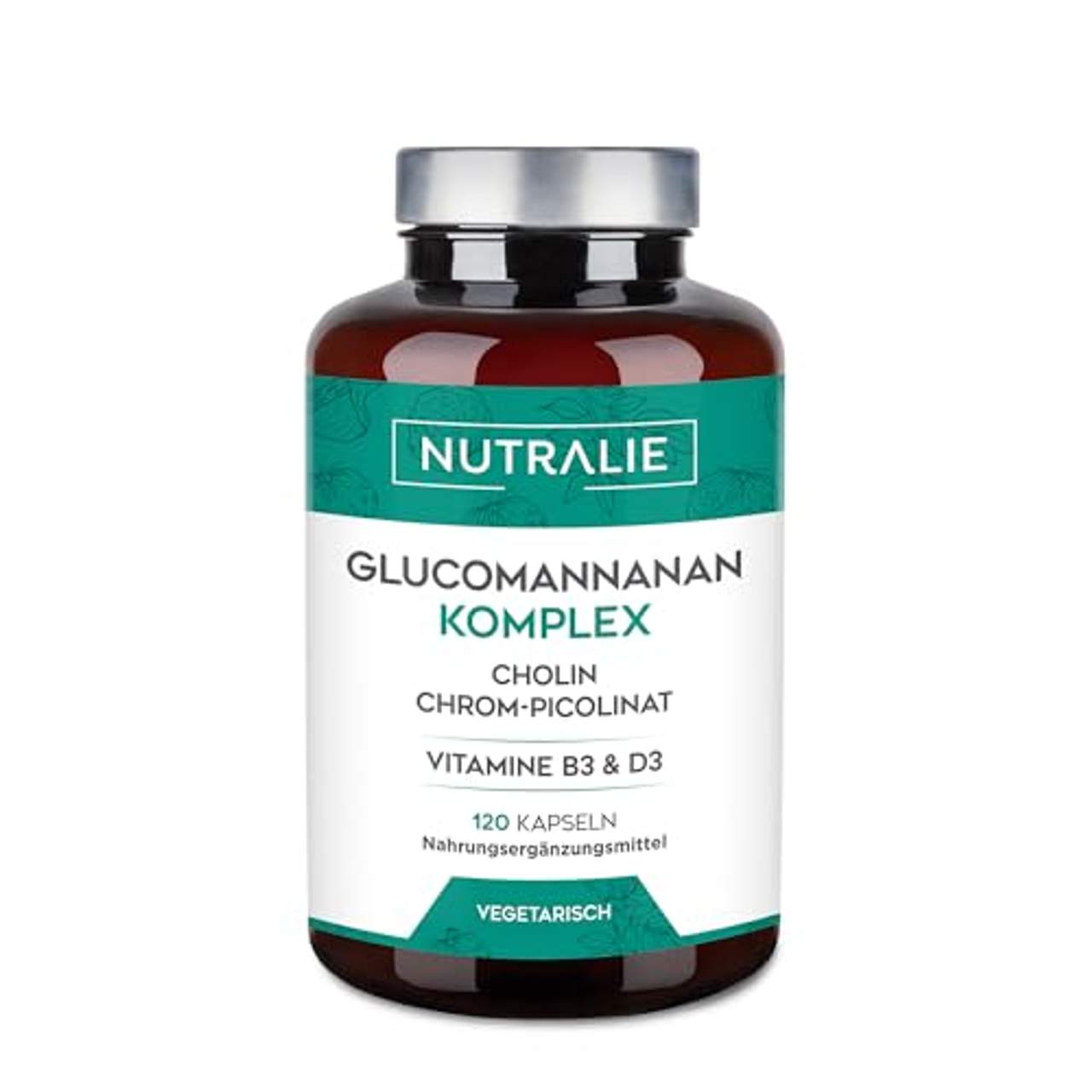 NUTRALIE Glucomannan KonjakGlucomananan: Unser Ballaststoff Glucomannan, der aus der Konjakwurzel gewonnen wird, trägt zu einem normalen Fettstoffwechsel und zur Aufrechterhaltung eines normalen Blutzuckerspiegels bei (von der Efsa genehmigte Information). Anreichung MIT Vitaminen UND Mineralen: Unser Nutralie Glucomannan vereint in seiner Formulierung Vitamin B3 und Vitamin D3, die zu einer normalen Funktion des Immunsystems beitragen (von der Efsa genehmigte Information).Erweiterte Formel: Das Rezept unseres Glucomannans ist sowohl für Männer als auch für Frauen geeignet und stellt eine erweiterte Zusammensetzung aus Glucomannan, Cholin-Bitartrat, Chrom-Picolinat und Vitaminen B3 und D3. Nutralie-Qualität: Unser Glucomannan wurde nach einem kontrollierten und zertifizierten Verfahren hergestellt und nach strengsten Qualitätsprotokollen vom Ursprung bis zum Endprodukt erarbeitet.Es kommt in 120 pflanzlichen Kapseln.