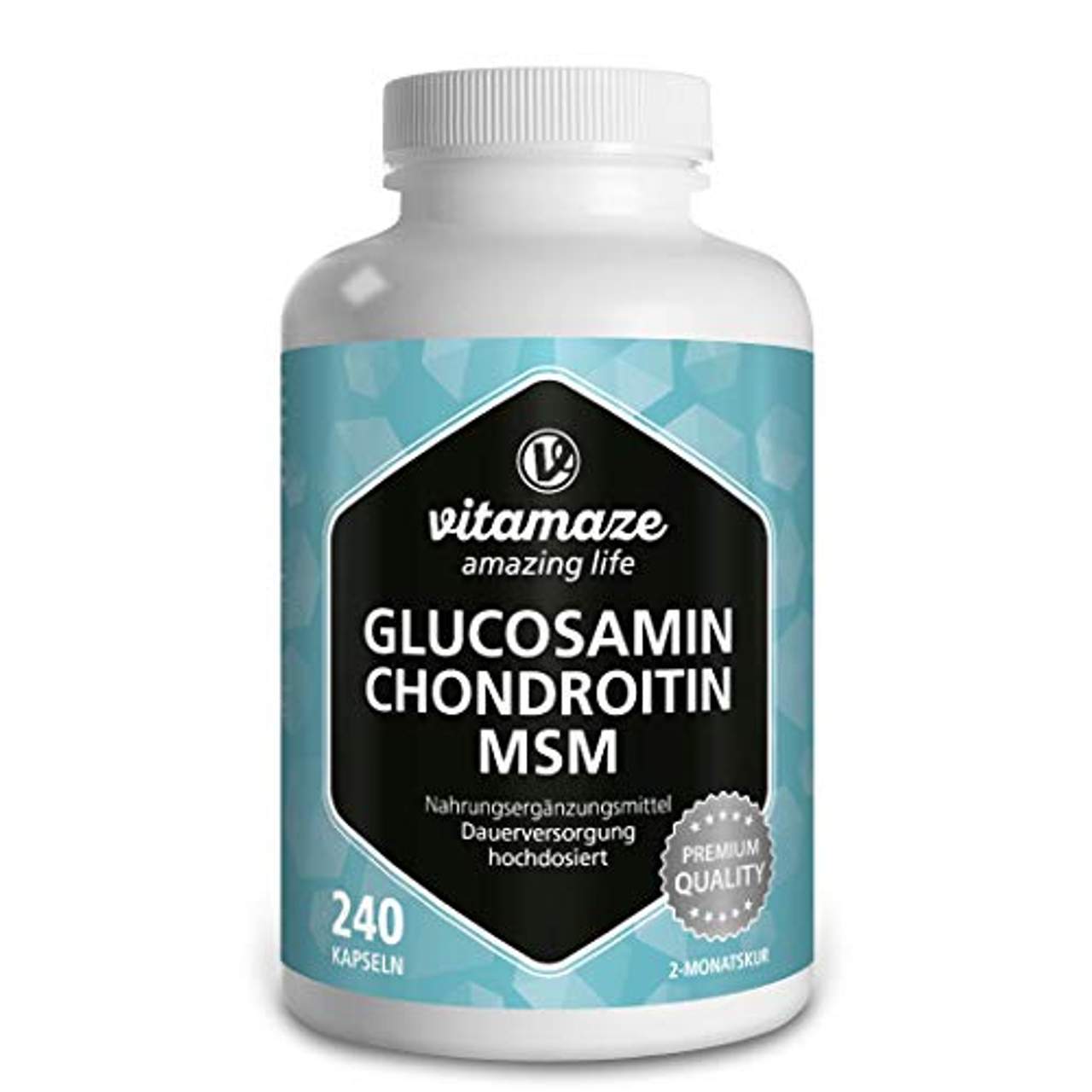 VISPURA VITAL-Komplex mit GlucosaminNahrungsergänzungsmittel sind kein Ersatz für eine ausgewogene, abwechslungsreiche Ernährung und eine gesunde Lebensweise. Glucosamin + Chondroitin + MSM | 240 Kapseln für eine 2-Monatskur Glucosamin ist Bestandteil des Bindegewebes, des Knorpels und der Gelenke und Chondroitin ist ein wichtiger Teil des Knorpelgewebes. In Kombination mit MSM (Methylsulfonylmethan) und Vitamin C, das zur normalen Kollagenbildung beitragen kann, die perfekte Mischung für Ihre Gelenke, Sehnen, Bänder, Knochen und Knorpel. Glucosamin + Chondroitin + MSM im Überblick Ideal kombiniert: Glucosamin, Chondroitin, MSM (Methylsulfonylmethan) & Vitamin C 2-Monatskur: 240 Kapseln reichen bei 2 x 2 Kapseln täglich 2 Monate Beste Bioverfügbarkeit: Ohne Trennmittel Magnesiumstearat und unnötige Zusatzstoffe Für Allergiker: Frei von Gluten, Laktose und anderen Allergenen Qualitätsprodukt: Deutsche Produktion mit HACCP-Konzept Anwendung von Glucosamin + Chondroitin + MSM Das Vispura Produkt ist ideal kombiniert für Ihre Gelenke, Sehnen, Bänder, Knochen und Knorpel. Glucosamin ist Bestandteil des Bindegewebes, des Knorpels und der Gelenke und Chondroitin ist ein wichtiger Teil des Knorpelgewebes. Und wie bei jedem Baustein unseres Körpers, kann es auch an diesem mangeln.Glucosamin und Chondroitin sind deshalb hochdosiert in den Kapseln vorhanden. Die tägliche Einnahme von 4 Kapseln versorgt Sie mit jeweils 625 Milligramm. MSM steht für Methylsulfonylmethan. Das ist eine andere Ausdrucksweise für organischen Schwefel, der mit 1.000 mg in der Tagesdosis von 4 Kapseln vorhanden ist. Vitamin C rundet das Vispura Produkt ab, da es neben vielen anderen Funktionen im menschlichen Organismus zur normalen Kollagenbildung beitragen kann. Eine Tagesdosis stattet Sie deshalb mit 80 mg oder 100% des Tagesbedarfs an Vitamin C aus. Wir empfehlen die Einnahme von 2 x 2 Kapseln am Tag. 240 Kapseln versorgen Sie 2 Monate lang mit den erwähnten Vitalstoffen. Zutaten: Methylsulfonylmethan (Msm), Chondroitin Natrium Sulfat, Glucosaminsulfat ( Krebstiere ), Kapselhülle: Gelatine vom Rind, Füllstoff: Mikrokristalline Cellulose, L-Ascorbinsäure, Trennmittel: Reis Extrakt Nährwerte: Pro 1 Kapsel 4 Kapseln Nrv* MSM 250,00 mg 1.000 mg / Chondroitin 156,25 mg 625 mg / Glucosamin 156,25 mg 625 mg / Vitamin C 20,00 mg 80 mg 100 % * Prozentsatz der empfohlenen Tagesdosis nach Anhang 13 der VO (Eu) Nr. 1169/2011 (Lmiv) Verzehrempfehlung: Erwachsenen wird empfohlen täglich 2 x 2 Kapseln mit jeweils 1-2 Gläsern Wasser (300-400ml) zu verzehren. Hinweis: Die angegebene empfohlene tägliche Verzehrmenge darf nicht überschritten werden. Nicht für Kinder und Jugendliche geeignet. Während Schwangerschafts- und Stillzeit sollte generell vor dem Verzehr von Nahrungsergänzungsmitteln ein Arzt konsultiert werden.Bei Verbrauchern mit Schluckbeschwerden oder bei unzureichender Flüssigkeitszufuhr besteht Erstickungsgefahr. Lagerung: Außerhalb der Reichweite von kleinen Kindern lagern. Ungeöffnet, kühl und trocken lagern. Nettofüllmenge: 208,8 g = 240 Kapseln Hersteller: Vitamaze GmbH Heiligenbergstr. 17 69121 Heidelberg