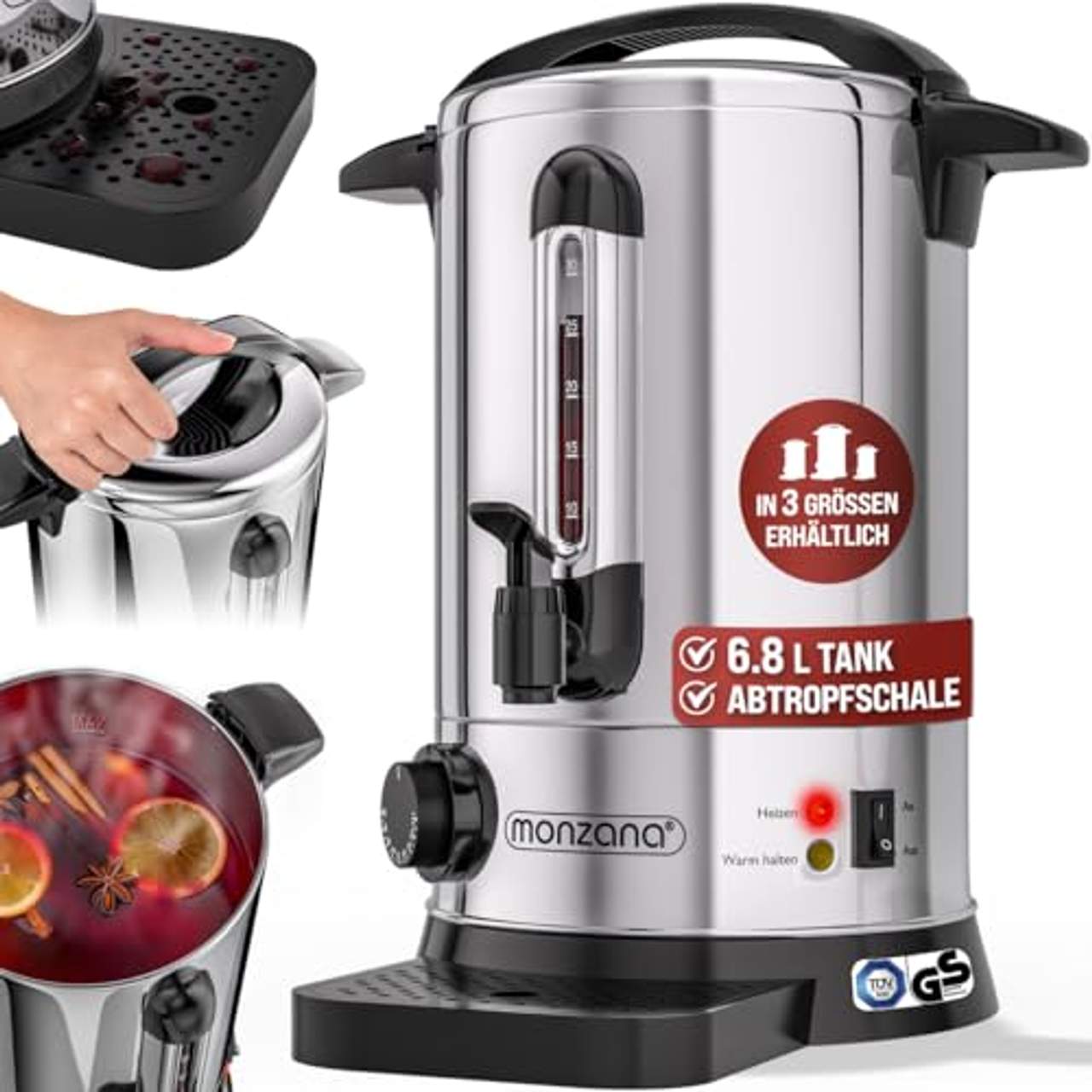 - Vielseitigkeit: Der Monzana Glühweinbereiter ist ein Heißgetränkespender mit großem Fassungsvermögen und einem Behältervolumen von 6,8 Litern, der für die Zubereitung einer Vielzahl von Heißgetränken wie Tee, Glühwein und Punsch, aber auch für die Zubereitung von kochendem Wasser verwendet werden kann.