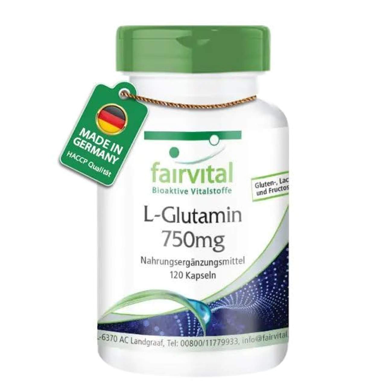 Fairvital L-Glutamin Kapseln 750mg sind ein hochdosiertes deutsches Qualitätsprodukt, das bis zu 3000mg L-Glutamin pro Tag liefert. Es ist frei von Gluten, Laktose, Fruktose, Magnesiumstearat, Konservierungsstoffen, Soja, Hefe, Pestiziden, Fungiziden, Kunstdüngern, Farbstoffen, Stabilisatoren und Gentechnik (NON-GMO). Die Kapsel wird in einer leichten Dose mit praktischem Dosierdeckel geliefert und hat eine Haltbarkeit von 24 Monaten. Es ist mikrobielle Reinheit Made in Germany nach Haccp und Herkunft der Rohstoffe aus EU- und Nicht-EU-Ländern. Es bietet auch Geld-zurück-Garantie für 24 Monate.