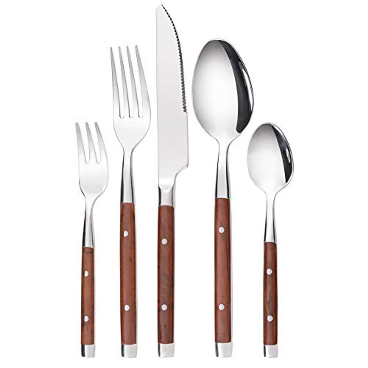 Die Griffe des Bestecksets sind aus durchgehendem Edelstahl mit Kunststoffgriffschalen gefertigt. Außerdem sind sie mit zwei Edelstahlnieten versehen, die für zusätzliche Festigkeit und Stabilität sorgen.