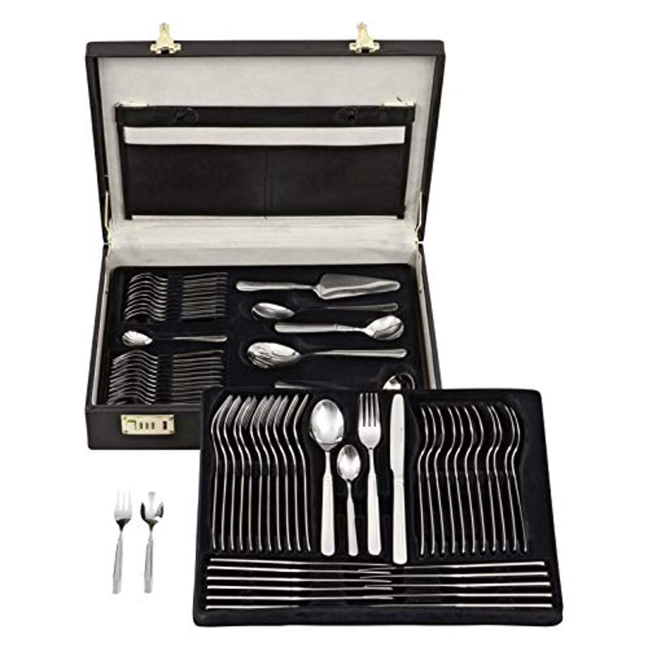 GRÄWE Besteckkoffer Serie "Leipzig"GRÄWE 68-teiliger Besteckkoffer, Menübesteck für 12 Personen, Serie LEIPZIGModernes Tafelbesteck für 12 Personen im schwarzen Besteckkoffer. Die GRÄWE Besteckserie LEIPZIG besticht durch dezentes Strichdekor und handpolierten Edelstahl. Der Koffer beinhaltet alles, was an Servier-, Salat- und Vorlegebestecken im Haushalt benötigt wird und eignet sich daher für den täglichen Gebrauch ebenso wie fürs Eindecken bei größeren Runden.Im Besteckkoffer mit Besteckeinlagen finden die einzelnen Besteckteile sortiert ihren Platz.Lieferumfang:12 MenümesserLänge ges. ca. 22 cm, Griffstärke ca. 4 mm, Gewicht ca. 60 g12 MenügabelnLänge ges. ca. 20 cm, Griffstärke ca. 2,5 mm, Gewicht ca. 45 g12 MenülöffelLänge ges. ca. 20 cm, Griffstärke ca. 2,5 mm, Gewicht ca. 52 g12 KaffeelöffelLänge ges. ca. 14 cm, Griffstärke ca. 2 mm, Gewicht ca. 20 g12 KuchengabelnLänge ges. ca. 14,8 cm, Griffstärke: ca. 2 mm, Gewicht ca. 20 g1 TortenheberLänge ca. 21 cm, Griffstärke ca. 2,5 mm, Gewicht ca. 45 g1 ServierlöffelLänge ca. 20,5 cm, Griffstärke ca. 2,5 mm, Gewicht ca. 55 g1 SahnelöffelLänge ca. 19 cm, Griffstärke ca. 2,5 mm, Gewicht ca. 50 g1 SalatlöffelLänge ca. 20 cm, Griffstärke ca. 2,5 mm, Gewicht ca. 50 g1 SalatgabelLänge ca. 20 cm, Griffstärke ca. 2,5 mm, Gewicht ca. 50 g1 SaucenlöffelLänge ca. 17,5 cm, Griffstärke ca. 2,5 mm, Gewicht ca. 55 g1 AufschnittgabelLänge ca. 15 cm, Griffstärke ca. 2 mm, Gewicht ca. 18 g1 ZuckerlöffelLänge ca. 14 cm, Griffstärke 2 mm, Gewicht ca. 20 g1 Besteckkoffer aus Kunstleder mit Zahlenschloss