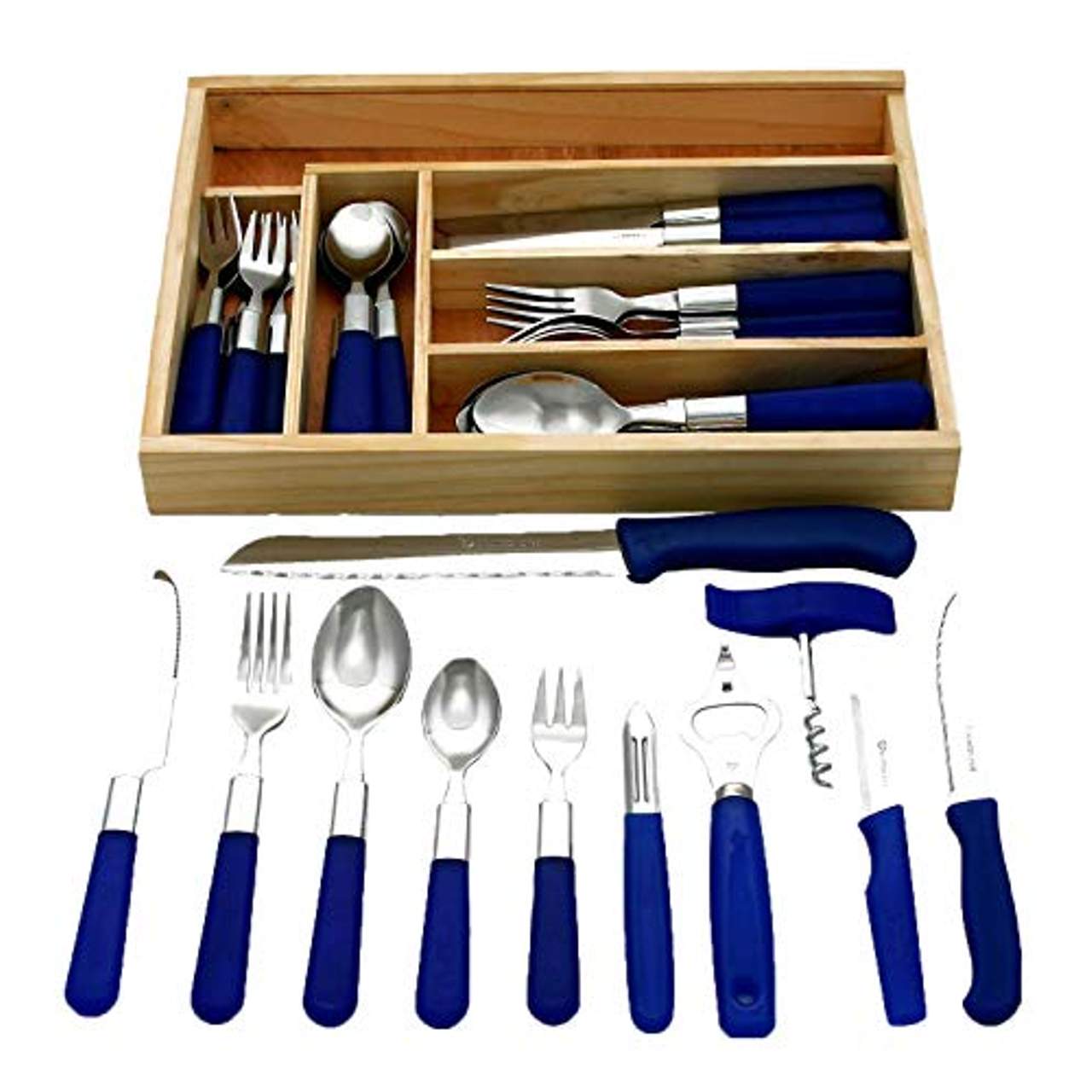 GRÄWE Starter-Set Serie "Milano"Das Set enthält Tafelbesteck für 6 Personen und praktische Küchenhelfer.Perfekt als Grundausstattung für die Haushaltsgründung oder das Ferienhaus.Lieferumfang:6 Menümesser mit Wellenschliff Maße: ges. 22 cm, Gewicht: ca. 30 g,6 Menügabeln Maße: ges. 20 cm Stärke ca. 1,4 mm Gewicht: ca. 30 g,6 Menülöffel Maße: ges. 20,5 cm Stärke ca. 1,5 mm Gewicht: ca. 45 g,6 Kaffeelöffel Maße: ges. 17 cm Stärke ca. 1,4 mm Gewicht: ca. 25 g,6 Kuchengabeln Maße: ges. 16,5 cm Stärke ca. 1,6 mm Gewicht: ca. 23 g,1 Brotmesser Länge ca. 30,5 cm,1 Küchenmesser Länge ca. 15 cm,1 Allzweckmesser Länge ca. 21 cm,1 Sparschäler Länge ca. 16 cm,1 Korkenzieher Maße ca. 10,5 x 8,5 cm,1 Flaschenöffner Länge ca. 18 cm,1 Besteckkasten aus Holz Gesamtmaße: 36 x 25 x 4,5 cm