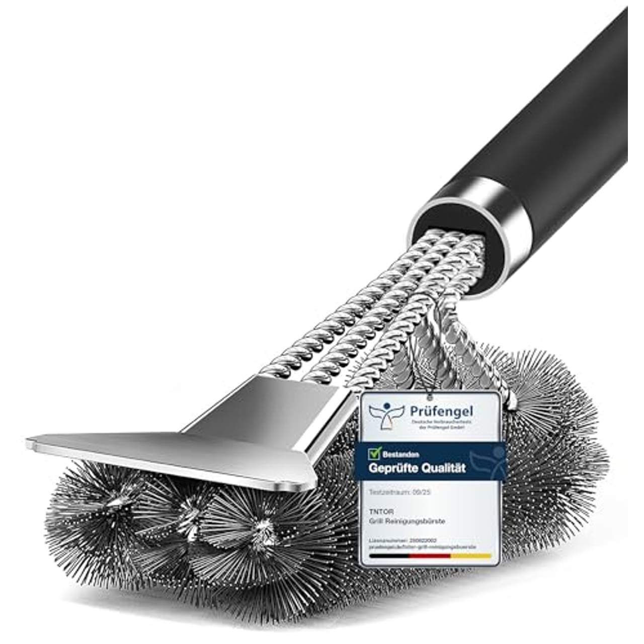 Die TNTOR Grillbürste TNTOR Grill Reinigungsbürste verfügt über ein 3-in-1-System mit einem scharfen Edelstahlschaber, der deinen Grill effektiv von Verschmutzungen befreit. Außerdem hat sie dreimal mehr Borsten als herkömmliche Bürsten, was eine schnellere und gründlichere Reinigung ermöglicht.