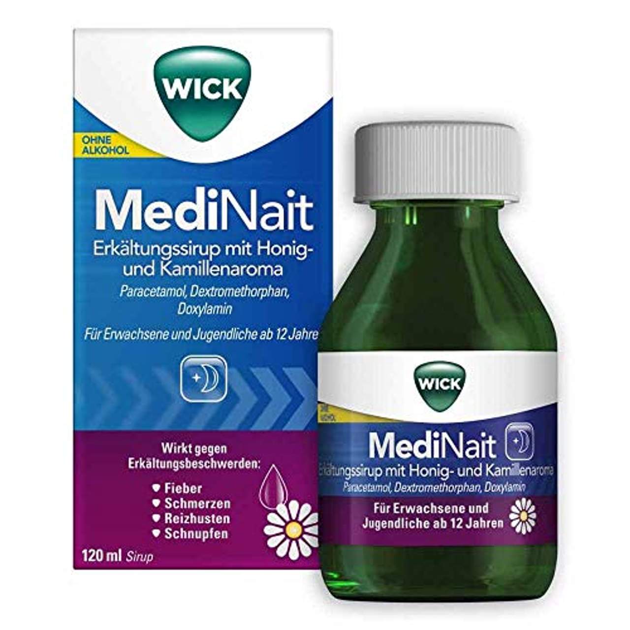 Procter & Gamble GmbH Wick MediNait Erk�ltungssirupDER Wirksame Erkältungssirup Ohne Alkohol DER Ihre Beschwerden IM Schlaf Bekämpft Genießen Sie Ihren Tag! Wick MediNait behandelt Ihre Erkältungsbeschwerden, während Sie schlafen, damit Sie sich am Morgen wie neu fühlen. Wick MediNait Erkältungssirup mit Honig- und Kamillenaroma wurde speziell entwickelt, um Erkältungsbeschwerden über Nacht zu bekämpfen.Enthält Paracetamol, Dextromethorphan, Doxylamin. Anwendungsgebiete: Zur symptomatischen Behandlung von gemeinsam auftretenden Beschwerden wie Kopf-, Glieder- oder Halsschmerzen oder Fieber Schnupfen Reizhusten infolge einer Erkältung oder einem Grippalen Infekt. Inhaltsstoffe: Wirkstoffe in 30 ml Sirup: Paracetamol 600 mg (Schmerzmittel) Doxylaminsuccinat 7,5 mg (mindert Nasenlaufen) Dextromethorphanhydrobromid 15 mg (Hustenstiller) Sonstige Bestandteile: Gereinigtes Wasser, Sucrose, Glycerol, Macrogol 6000, Natriumcitrat 2H2O, Citronensäure-Monohydrat, Natriumbenzoat, Kaliumsorbat, Honig-Kamillenaroma Zu Risiken und Nebenwirkungen lesen Sie die Packungsbeilage und fragen Sie Ihren Arzt oder Apotheker.Wick Pharma, Zweigniederlassung der Procter & Gamble GmbH, D-65823 Schwalbach