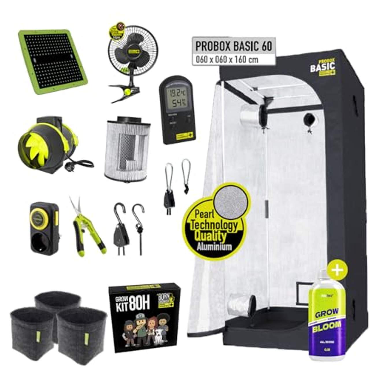 Dieses Komplettset enthält eine Reihe von wichtigen Komponenten, die das Gärtnern im Haus einfach machen. Du findest ein geräumiges Growzelt mit den Maßen 60x60x160 cm für die Kultivierung von drei bis sechs Pflanzen. Außerdem enthält es das LEDMAXPRO+ Grow-Licht für eine optimale Beleuchtung, einen leistungsstarken 10-cm-Inline-Ventilator für die Belüftung, einen Kohlefilter, um Gerüche in Schach zu halten, einen Geschwindigkeitsregler für den Ventilator, ein Thermometer und ein Hygrometer für die Überwachung der Bedingungen, einen Timer für die Steuerung der Lichtzyklen und fünf 10-Liter-Stofftöpfe, die ausreichend Platz für die Wurzeln bieten. Außerdem werden Aufhänger und Klammern für einen einfachen Aufbau mitgeliefert.