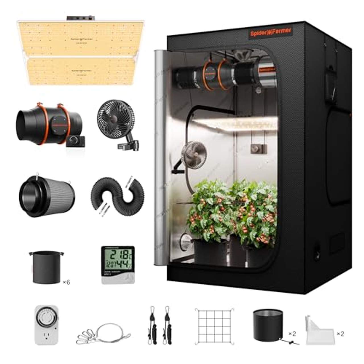 | Lieferumfang | 1 × SF4000 450W Full Spectrum Samsung lm301H EVO LED Grow Light, 2 × Light Hanging Ropes, 2 × Metal Hanging Kits, 1 × 4′ x 4′ x 6.5′ (120x120x200 cm) Grow Tent, 1 × high-quality reusable Trellis Plant Netting, 39.4″ x 39.4″ (100 x 100 cm) with 10×10 cm squares (unstretched), 1 × 6” Clip Fan, 1 × 6” Inline Duct Fan, 1 × Fan Speed Controller, 1 × 6” Carbon Filter, 1 × Pre-filter, 1 × Flex Air Aluminum Ducting, 3 × Hose Clamps for connecting and securing fan and ducting, 1 × Thermometer and Hygrometer, 1 × Timer, 6 × 5 Gallon Grow Bags, 2 × Corner Shelves, 2 × Duct Filter Vent Covers to prevent dust and pests and prolong fan life, 2 × Magic Straps, 2 × Regular Straps |