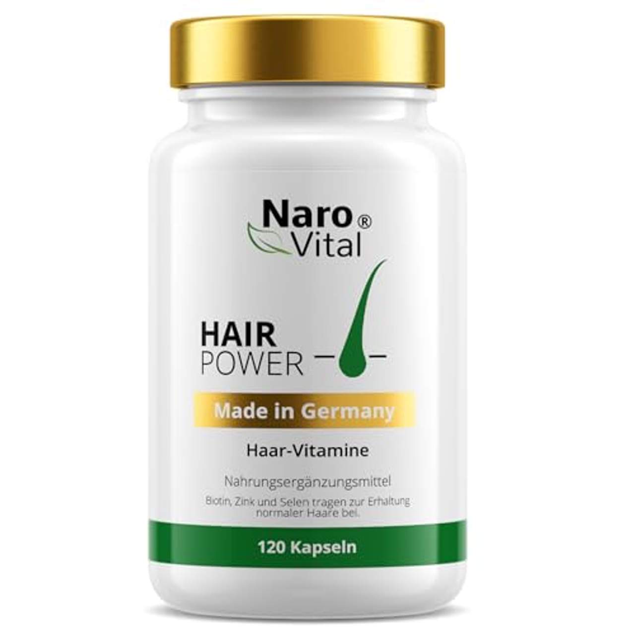 NaroVital Haar-Vitamine HochdosiertFür natürlich schöne Haare Bist du auf der Suche nach einer Möglichkeit, dein Haar von der Wurzel bis in die Spitzen zu stärken und zu unterstützen? Dann sind unsere Haar Vitamine genau das Richtige für dich.Unsere einzigartige Beauty-Komplex-Formel basiert auf den neuesten wissenschaftlichen Erkenntnissen und versorgt dein Haar mit wirksamen Inhaltsstoffen wie Biotin, Zink und Selen, die zur Erhaltung normaler Haare beitragen. Gesundes, volles und schönes Haar steht für Attraktivität und Schönheit.Das spiegelt sich auch in deinem Selbstbewusstsein wider. Für schöne Haut & starke Nägel Aber unsere Haar Vitamine bieten noch mehr: Mit Niacin, Riboflavin, Vitamin A, Zink und Biotin versorgen sie deinen Körper mit der vollen Mikronährstoff-Power für eine gesunde Beschaffenheit und Funktion der Haut. Diese Nährstoffe unterstützen nachweislich die Erhaltung deiner normalen Haut. Um das umfassende Beauty-Wirkspektrum von Hair-Power abzurunden, unterstützen die Spurenelemente Zink und Selen zudem erwiesenermaßen die Erhaltung normaler Nägel.Feste Nägel dienen nicht nur dem Schutz empfindlicher Körperstellen und der Sinneswahrnehmung, sondern beeinflussen maßgeblich die Attraktivität deiner Hände! Auch für Männer geeignet Langes, kräftiges und volles Haar steht ganz oben auf der Beauty-Wunschliste vieler Frauen.Aber nicht nur für Frauen spielt die Haargesundheit eine wichtige Rolle, denn auch viele Männer leiden an schütterem & kraftlosem Haar, einem lückenhaften Bartwuchs oder sogar Haarausfall. Unsere Haar Vitamine bieten nicht nur Frauen die Möglichkeit, ihre Haargesundheit zu unterstützen sondern auch Männern. Teste jetzt unsere beliebten Haar Vitamine und stärke dein Haar von der Wurzel bis in die Spitzen.Du wirst das Ergebnis lieben!