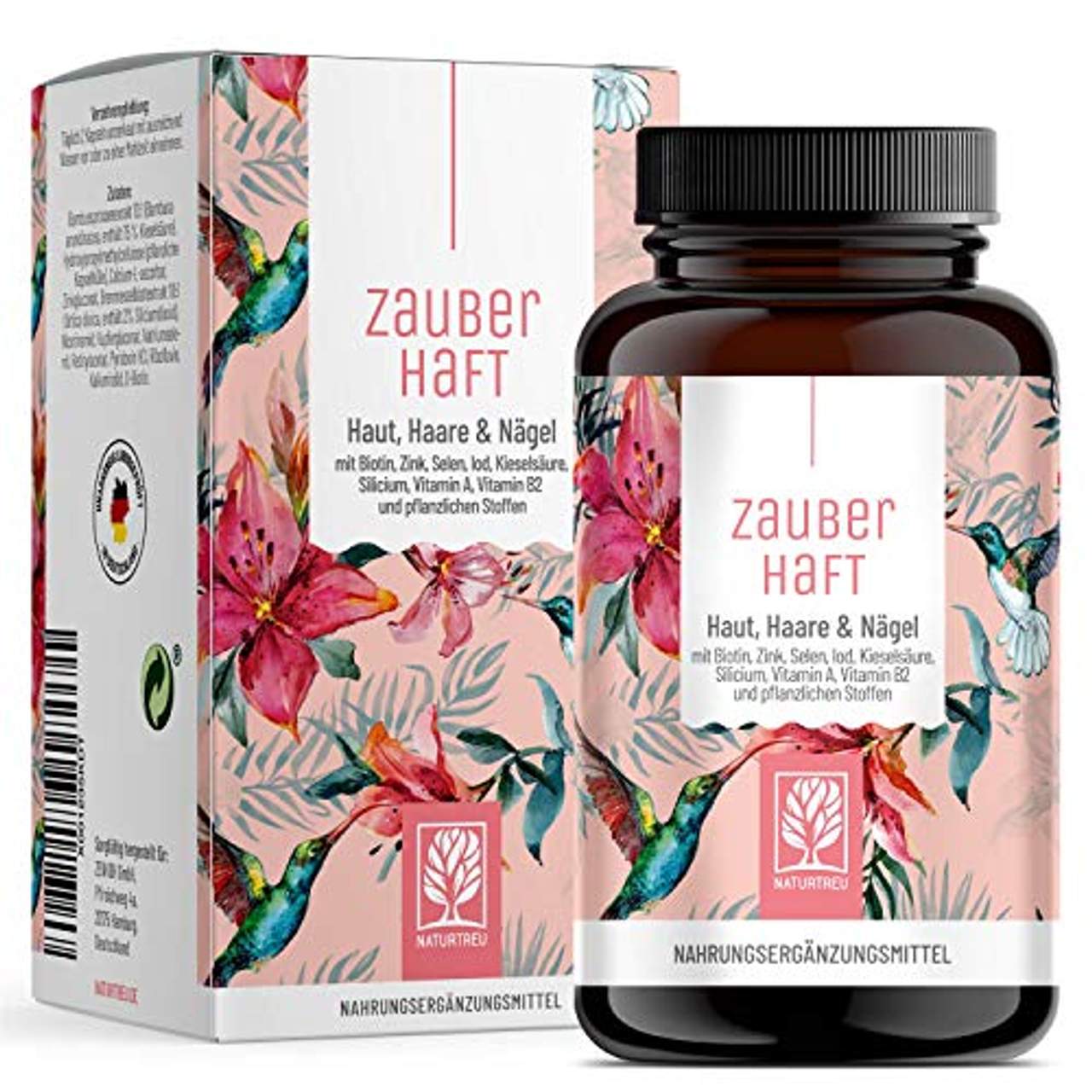 NATURTREU Haar VitamineZauberhaft - Informationen auf einen Blick: Pro Tagesdosis (2 Kapseln): hochdosiertes Silizium - aus 600 mg Bambussprossenextrakt (10:1 Extrakt mit 75% Siliciumoxid = 450mg) Essenzielle Mineralstoffe & Spurenelemente: Mit 400 μg Biotin, 10 mg Zink, 37,5 μg Jod, 1.000 μg Kupfer und 55 μg Selen Hochwertiges Superfood: Zusätzlich 50 mg Brennesselextrakt (10:1 Extrakt) Unterstützende Vitamin-Kombination: Mit 800 μg Vitamin A, 1,4 mg Vitamin B2, 1,4 mg Vitamin B6, 16 mg Vitamin B3 und 80 mg Vitamin C Reinheit: ohne Gentechnik, ohne Magnesiumstearat und ohne Mikroplastik Ein sicheres Gefühl: Unabhängige Laborprüfungen auf Belastung und Wirkstoffgehalt werden regelmäßig durchgeführt Wichtger Hinweis: Bitte halten Sie sich an die Verzehrempfehlung und nehmen die Kapseln zu einer Mahlzeit ein.Warum Silizium? Der feine Unterschied Das essenzielle Spurenelement Silizium ist einzigartig, denn: Es ist der strukturelle Bestandteil in vielen Gewebearten! Das ist optimal, da Silizium in dieser Verbindung wasserlöslich ist und mit einer hohen Verfügbarkeit vom Körper aufgenommen und verarbeitet werden kann.In Zauberhaft verwenden wir einen hochwertigen Bambussprossenextrakt, welcher einen Anteil von 75 % Siliciumdioxid enthält und kommen damit auf stolze 450 mg Siliciumoxid pro Tagesdosis. Abgerundet durch die drei Beauty-Musketiere: Biotin - Zink - Selen Biotin, Selen und Zink tragen zur Erhaltung normaler Haare bei. Zink und Selen tragen zur Erhaltung normaler Nägel bei. Biotin und Zink tragen zur Erhaltung normaler Haut bei.