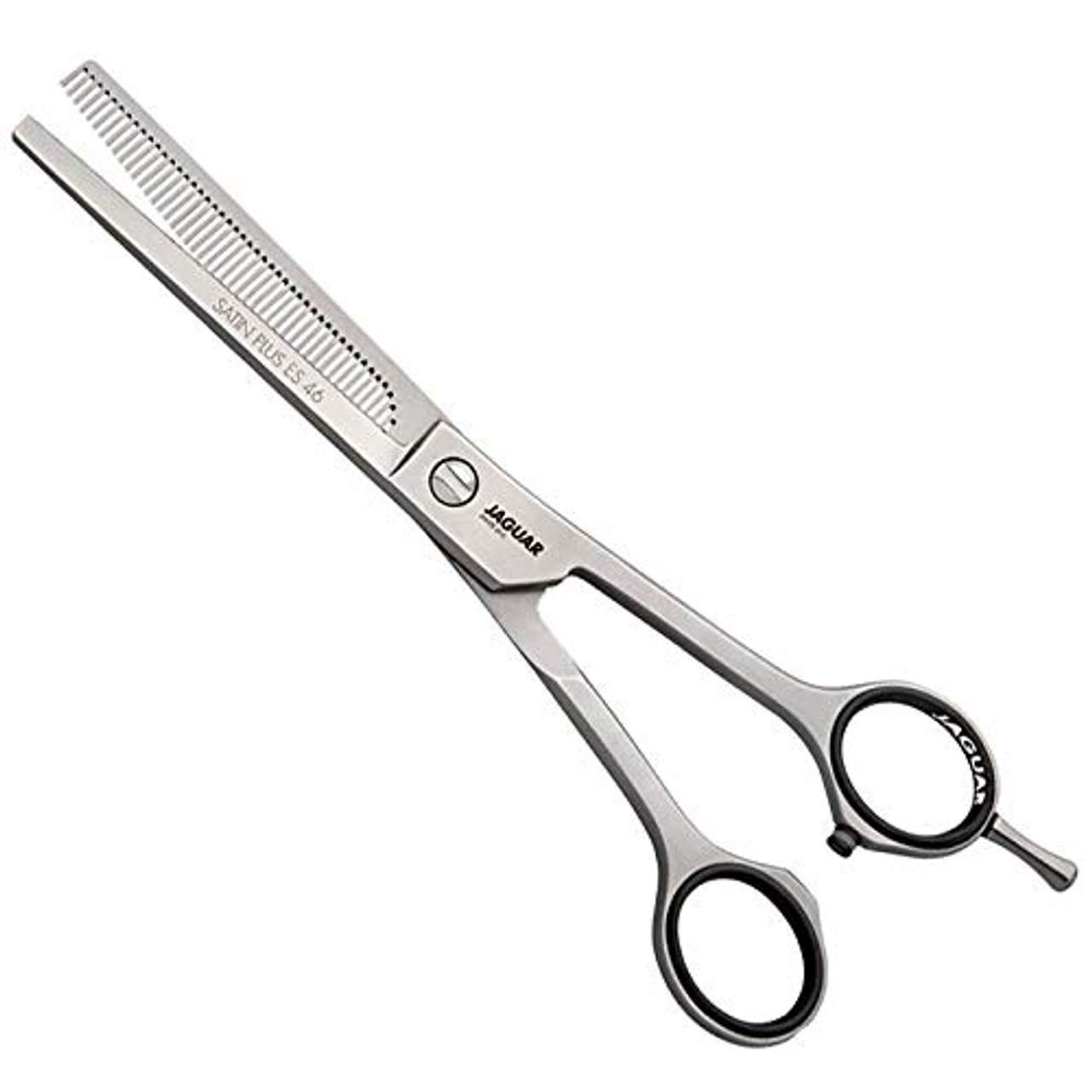 Jaguar Schere Satin Plus E 46 6.5 Zoll/17 cmDie Jaguar White Line Satin Plus E 46 Effilierschere 6.5" 17 cm ist eine Friseurschere im Offset Design die mit einer ergonomischen Griffstellung für ein entspanntes Arbeiten sorgt. 46 Effilierzähne mit feinster Prismenverzahnung sorgen für ein angenehm sanftes Gefühl beim Schneiden und gewährleisten einen einwandfreien sowie präzisen Schnitt.Die Effilierschere besteht aus einem rostfreien und geschmiedetem Qualitätsstahl der mit einem Eishärteverfahren bei -80 °C gehärtet wird und der Schere eine lang anhaltende Schärfe und eine solide Härte verleiht. Durch ein Abrichtverfahren und der Vario-Verschraubung erhält die Klinge eine genaue sowie exakte Form die für eine leichte und sehr gute Gängigkeit sorgt.Die Vario-Verschraubung kann schnell und einfach nachjustiert werden.Vorteile - Effilierschere- präziser Schnitt- lang anhaltende Schärfe- leichte, sehr gute GängigkeitPflegeDie Klingen und die Gangstelle täglich mit einem weichen Tuch reinigen. Einen Tropfen Jaguar Pflegeöl für eine optimale Schneidleistung auf die Gangstelle geben und die Schere zum Verteilen des Öls mehrmals öffnen und schließen.Inhalt:1 Stk. Anwendung: Die verbindliche Angabe der Anwendung entnimmst du bitte der Verpackung bzw. der beiliegenden Bedienungsanleitung des gelieferten Produktes.