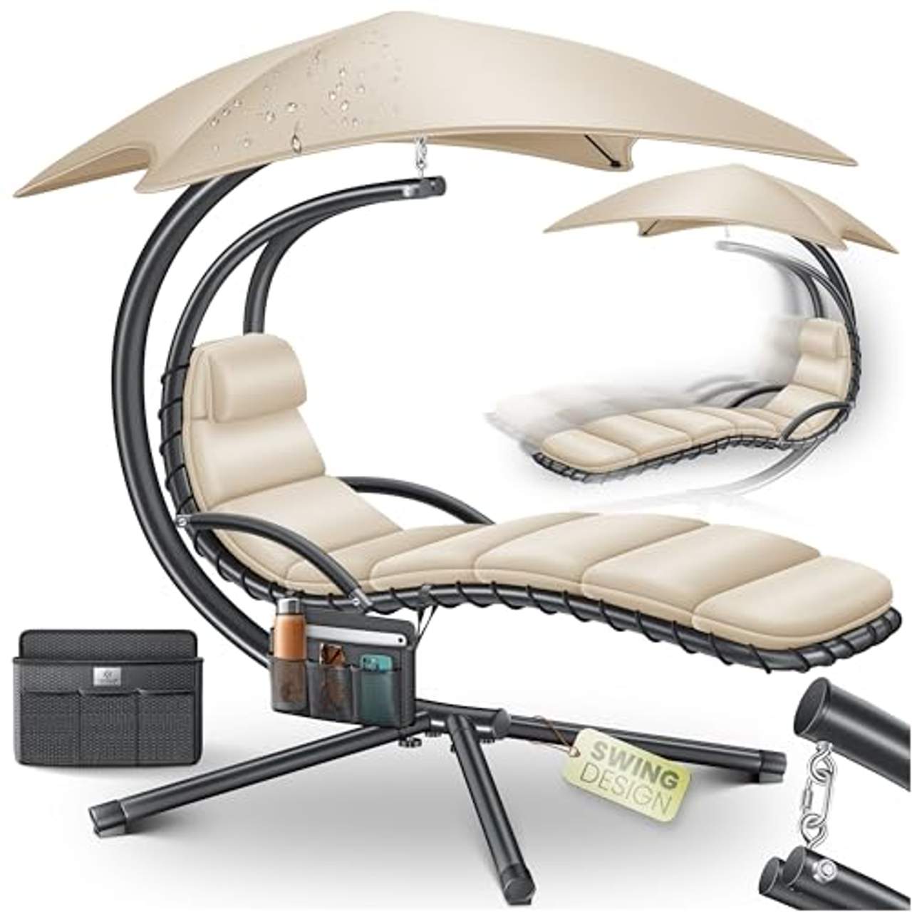 Ein besonderes Merkmal der KESSER Schwebeliege mit Sonnenschirm ist die Aufhängung mit Karabinerhaken, die sanfte Schaukelbewegungen ermöglicht, wenn du dich darauf niederlässt. Dieses einzigartige Design bietet nicht nur eine ruhige Art zu entspannen, sondern bringt auch ein spielerisches Element in dein Liegeerlebnis.