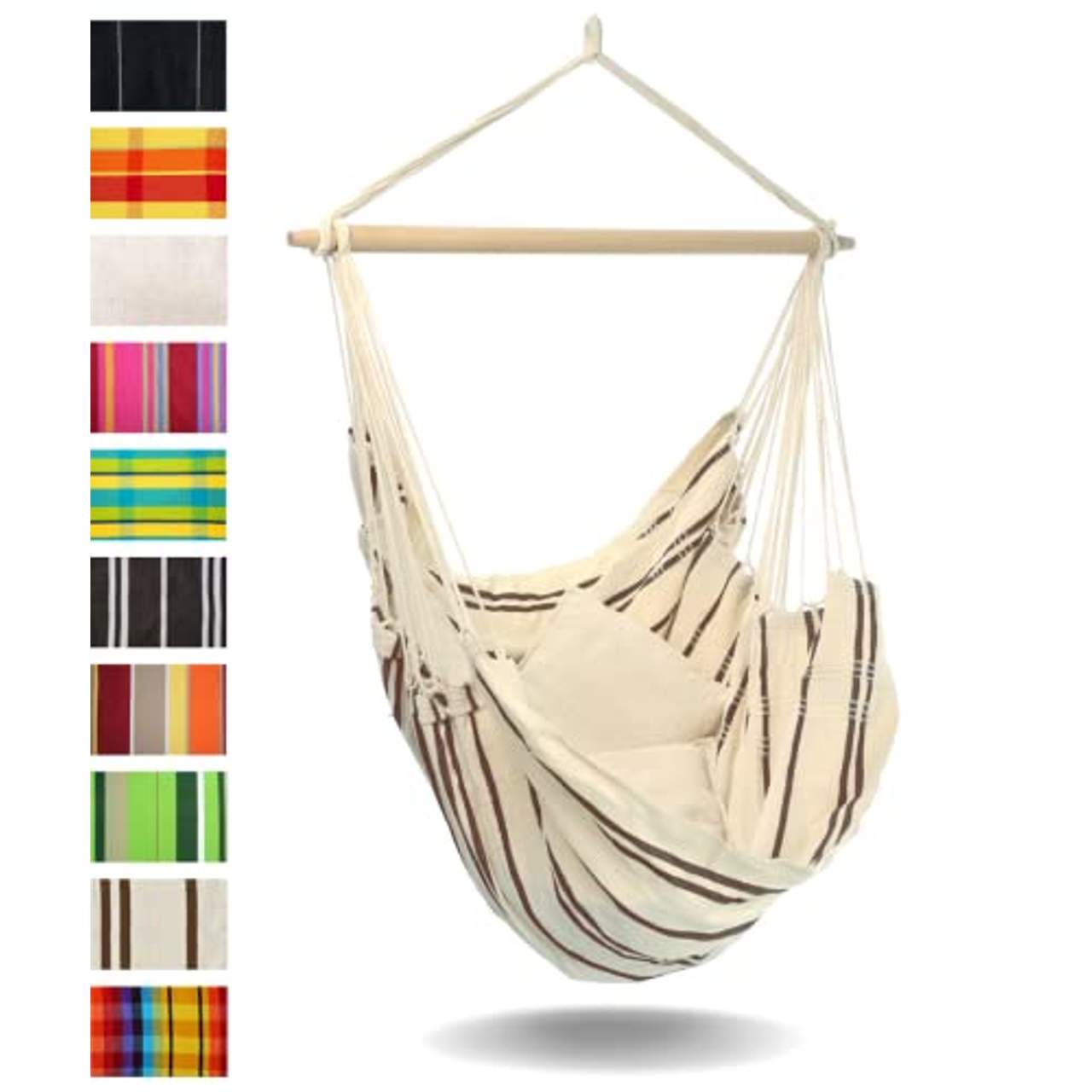 - Flexible Installation: Der Hängesessel kann an Deckenhaken, Hängesesselgestellen, Ästen und vielem mehr befestigt werden. Das flexible Aufhängesystem verfügt über einen patentierten, drehbaren, 110 cm langen Holzstab, der ein Verrutschen der Seile im Inneren verhindert.