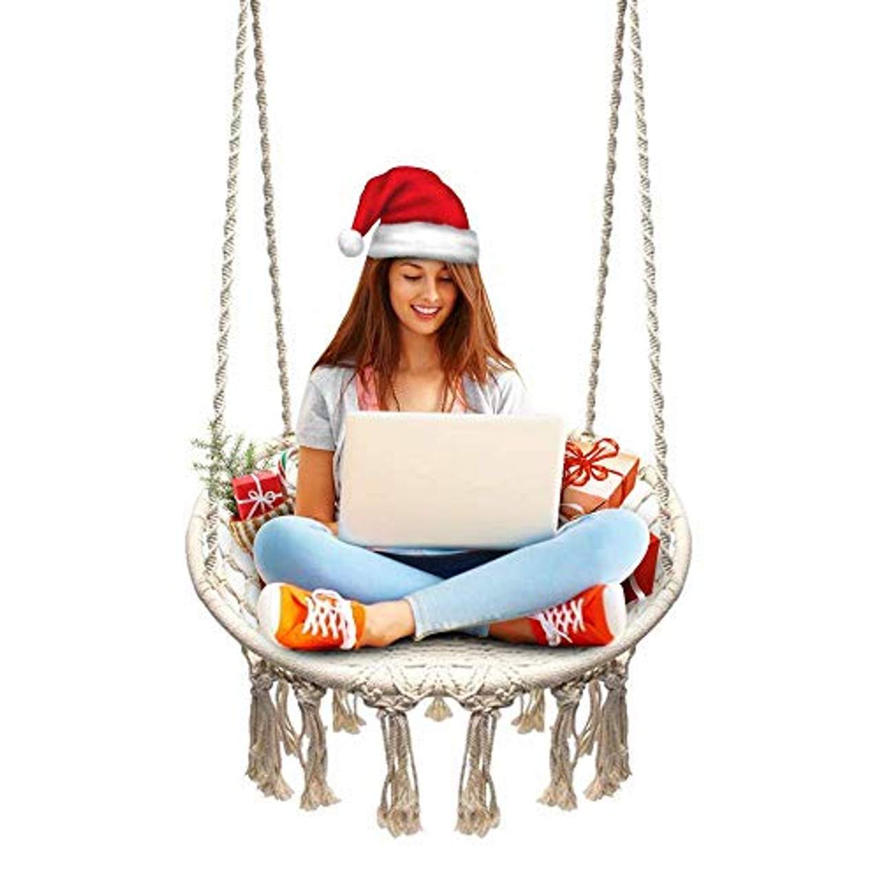 - Stark und sicher: Der Hängesessel ist 80CM L X 80CM B X 110CM H (Höhe des Stuhls, ohne Seil und Fransen ist 55CM). Es ist sorgfältig mit hoher Festigkeit Baumwollseil Weben ausgewählt, 4 Hauptlinien stärken den Hängesessel, mit einer maximalen Kapazität von 120KG.