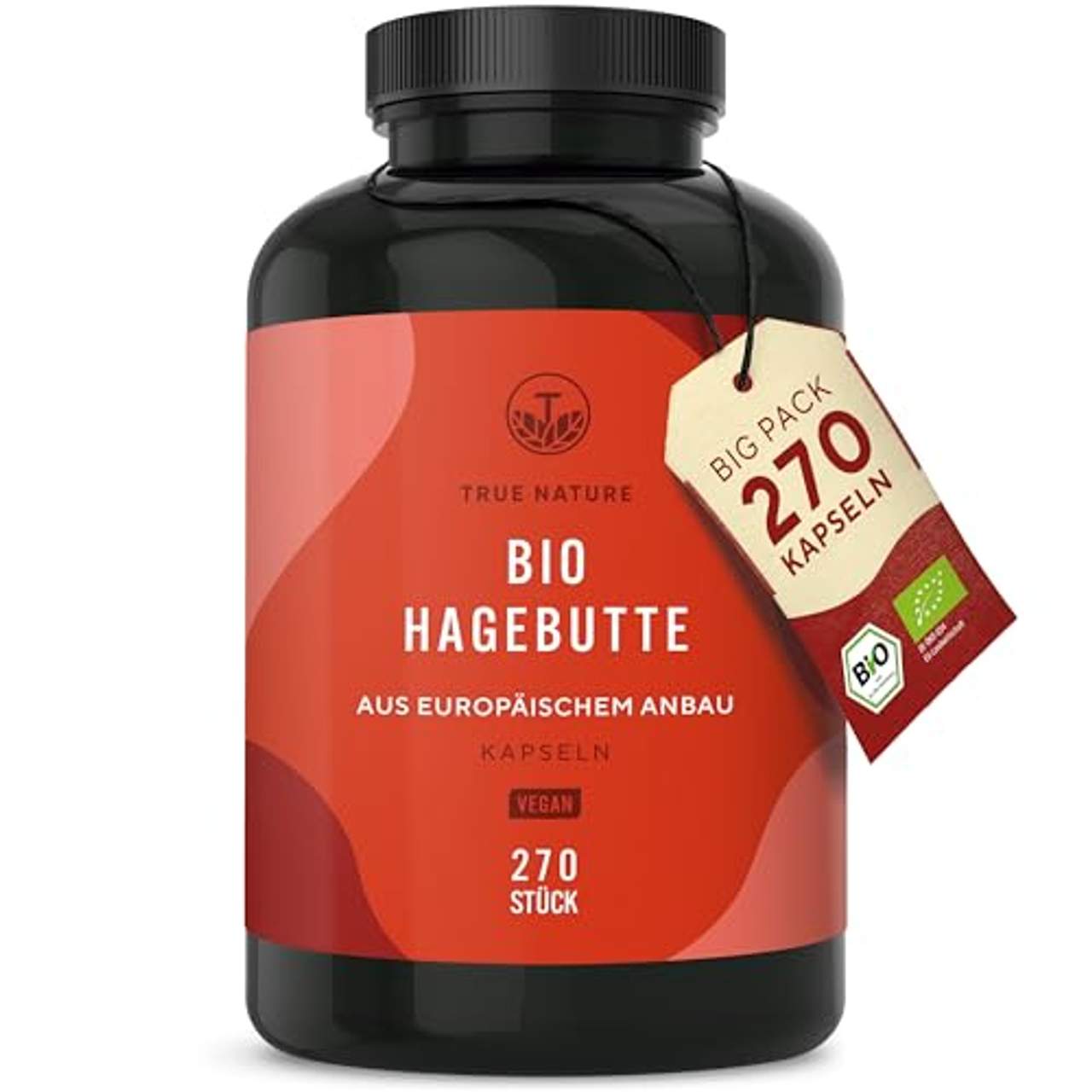 Bio Hagebutten Kapseln hochdosiertTrue Nature Bio Hagebutten Kapseln - Natürlich, Hochdosiert und Vegan Unsere True Nature Bio Hagebutten Kapseln sind ein Premium-Nahrungsergänzungsmittel, hergestellt aus 100% reinem Hagebuttenpulver aus den Hauptanbaugebieten in Bulgarien. Jede Tagesdosis enthält 650mg reines Hagebuttenpulver, was sie zu einer hochdosierten Quelle dieses nährstoffreichen Superfoods macht.Qualität und Reinheit Wir beziehen unsere Hagebutten aus ökologischen Anbaugebieten in Bulgarien und verarbeiten sie durch einen schonenden Prozess, um sicherzustellen, dass Sie nur das Beste aus der Natur erhalten. Unsere Kapseln sind komplett ohne Zusatzstoffe, was bedeutet, dass sie vegan, glutenfrei, laktosefrei und GMO-frei sind.Natürliche Quelle von Vitamin C und Ballaststoffen Hagebutten sind eine Quelle von natürlichen Inhaltsstoffen und reich an Ballaststoffen. Sie sind bekannt für ihren hohen Gehalt an Vitamin C, das als starkes Antioxidans bekannt ist und das Immunsystem unterstützen kann. Einfache Einnahme Die Einnahme unserer Bio Hagebutten Kapseln ist unkompliziert. Sie können sie jederzeit, unabhängig von den Mahlzeiten, einnehmen. Unsere Empfehlung: Nehmen Sie dreimal täglich zwei Kapseln mit ausreichend Flüssigkeit ein.True Nature - Ihr Partner für natürliche Gesundheit Bei True Nature glauben wir an die Kraft der Natur und daran, dass eine gesunde Ernährung der Schlüssel zu einem gesunden Leben ist. Unsere Bio Hagebutten Kapseln sind nur ein Teil unseres Engagements, Ihnen hochwertige, natürliche Nahrungsergänzungsmittel zu bieten, die Ihnen helfen, Ihr Wohlbefinden zu verbessern.Bestellen Sie jetzt Ihre True Nature Bio Hagebutten Kapseln und erleben Sie die Vorteile von Hagebutten selbst!