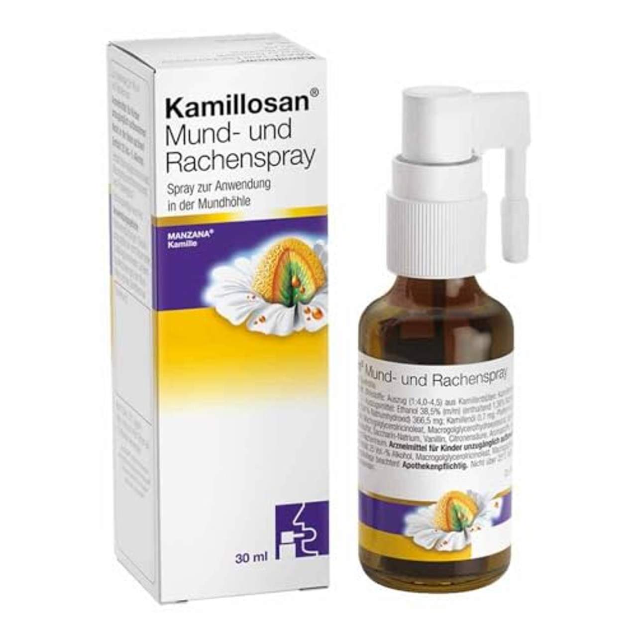Kamillosan Mund- und RachensprayBei Rachenentzündungen im Falle von nicht fieberhaften Erkältungskrankheiten sowie bei Schleimhautentzündungen der Mundhöhle und des Zahnfleisches wie z.B.: Halsschmerzen Schluckbeschwerden leichte Mandelentzündungen Zahnfleischentzündungen/-reizungen Enthält: Auszug aus Blüten, der Manzana-Kamille, ätherische Öle aus Anis und Pfefferminze, 25 Vol.-% Alkohol. Anwendungsgebiete: Rachenentzündungen (Tonsillopharyngitis) bei nicht fieberhaften Erkältungskrankheiten, Schleimhautentzündungen der Mundhöhle und des Zahnfleisches. Warnhinweise: Enthält 25 Vol.-% Alkohol.