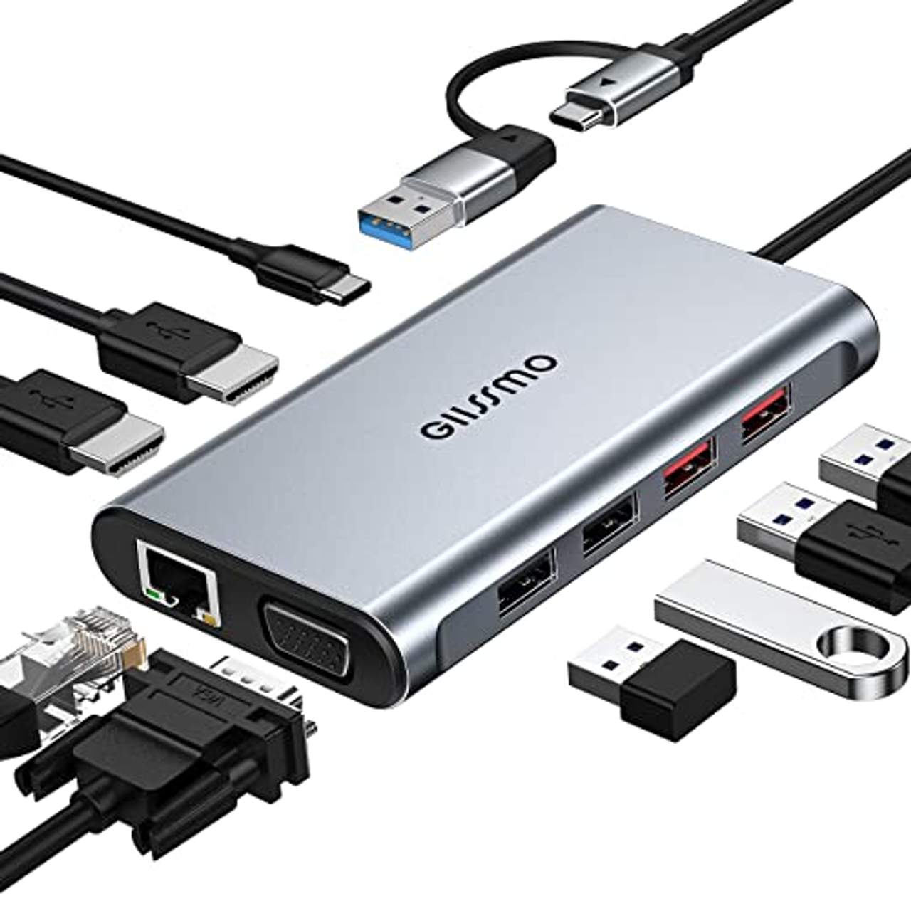 Die GIISSMO USB-Dockingstation verfügt über zwei HDMI-Anschlüsse, einen VGA-Anschluss, 1000-Mbit/s-Ethernet-Anschlüsse, zwei USB-3.1-Anschlüsse, zwei USB-2.0-Anschlüsse und einen USB-Ladeanschluss, der speziell zum Aufladen der Dockingstation selbst dient.