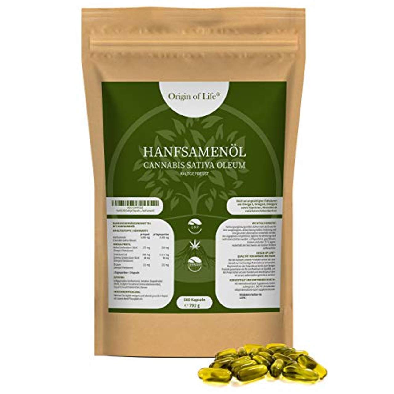 Hanföl 500 Softgel KapselnOrigin of Life Hanföl / Hanfsamenöl Hanföl (Hanfsamenöl) zählt mitunter zu den wertvollsten Ölen der Welt und wird mittels einem aufwendigen Extraktionsverfahren aus dem Samen der Cannabispflanze gewonnen. Im &bdquo Volksmund&ldquo wird Hanföl auch als die nährstoffreichste Öl-Quelle für den Menschen bezeichnet.In den östlichen Kulturen wird Hanföl, aufgrund seiner positiven Eigenschaften schon seit Jahrhundert erfolgreich verwendet. Highlights auf einen Blick: Unsere Hanfölkapseln sind extra hochdosiert mit je 1000 mg Hanföl. In jedem Beutel befinden sich 500 Kapseln im Vorratspack und bietet eine sehr gute Alternative zu Fischöl-Kapseln & Quelle für pflanzliche & essentielle Fettsäuren (EPA / DHA). Enthält wichtige Flavonoide, Mineralstoffe und Terpene, Omega-3, Omega-6 Omega-9 Fettsäuren, Alpha-Linolensäure (ALA), Gamma-Linolensäure (GLA), Linolsäure (LA), Stearidonsäure (SDA), Vitamine (A, C, E, Beta-Carotin) & natürliche Antioxidantien. Für unsere Hanfsamenöl-Kapseln verwenden wir ausschließlich Hanföl aus Kaltpressung in einer flüssig &bdquo Rapid Release&ldquo Softgelkapsel für eine schnelle Freisetzung und optimale Bioverfügbarkeit. Das perfekte 1:3 Verhältnis von Omega 3 zu 6 ist der Vorteil unserer Hanfölkapseln gegenüber anderen Pflanzenölen wie Algenöl,Lachsöl, Leinöl, Mandelöl, oder Schwarzkümmelöl. Frei von Aromen, Farbstoffen, Stabilisatoren, Magnesiumstearat, Konservierungsmitteln, Füllstoffen, Laktose, Gluten, Soja. Hanfölkapseln von Origin of Life im Detail Unsere Hanföl-Kapseln sind hochdosiert mit 1000mg je Kapsel und enthalten eine der höchsten Konzentrationen an essentiellen & mehrfach ungesättigten Fettsäuren, wie Omega-3 & Omega-6, welche der Körper nicht selber herstellen kann und das in einem optimalen Verhältnis von 3:1. Darin enthalten ist Alpha-Linolsäure (ALA), Gamma-Linolsäure (GLA), Linolsäure (LA), Stearidonsäure (SDA), sowie Phytonutrienten, Terpene, Vitamine (A, C, E, Beta-Carotin), Mineralien (Phosphor, Kalium, Magnesium, Calcium), natürliche Antioxidantien, das Pflanzenpigment Chlorophyll, sowie alle 9 essentiellen Aminosäuren welche unser Körper nicht alleine produzieren kann . Zudem bietet es eine sehr gute Alternative zu Omega 3 Fischöl Kapseln. Durch die Verwendung unserer Rapid Release Softgel-Kapseln weisen Sie keinen unangenehmen Geschmack oder Geruch auf. Und sorgen zudem für eine schnelle Freisetzung und Aufnahme über die Magenschleimhaut. Wir verwenden ausschließlich Hanföl aus Kaltpressung damit die wichtigen Inhaltsstoffe beibehalten werden.Origin of Life - Qualität von Anfang bis Ende bei der Auswahl unserer Produkte achten wir stets darauf, nur Materialien aus deutscher Produktion und Herstellung zu verwenden! Um den Ansprüchen unserer Kunden und an uns selbst gerecht zu werden, garantieren wir für ein Maximum an Qualität, von der Verpackung bis zum fertigen Produkt!Wir stehen für: Premium Qualität Made in Germany Kompromisslose & hochwertige Produkte Hervorragendes Preis-Leistungs-Verhältnis