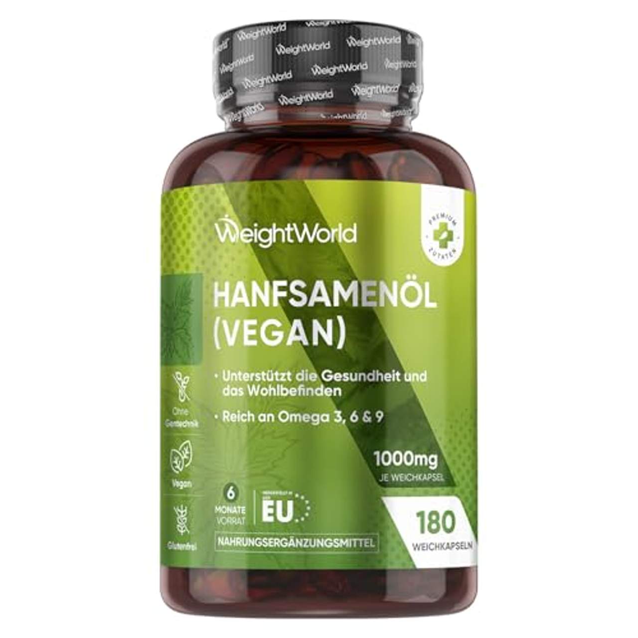 WeightWorld Hanföl Kapseln 1000mgKaltgepresste Hanföl Kapseln - Wir bieten Ihnen 1000mg pro Weichkapsel für eine optimale Preis-Leistung und mit 180 Kapseln einen Vorrat für 6 Monate. Die Hanföl Kapseln haben viele natürliche Vorteile für den Körper. Besonders die enthaltenen essentiellen ungesättigten Fettsäuren wie Omega-3 Alpha-Linolensäure (ALA), Omega-6 Linolsäure (LA) und Omega-9 Ölsäure (OA). Nehmen Sie 1 Weichkapsel täglich mit einem Glas Wasser ein, vorzugsweise zu einer Mahlzeit. Hanföl Kapseln als Alternative zu Fischöl - Hanfsamenölkapseln sind eine der besten Alternativen für alle, die den fischigen Geruch und Geschmack von Fischöl vermeiden wollen. Unsere Hanföl Kapseln enthalten ALA, die der Körper in Eicosapentaensäure (EPA) und Docosahexaensäure (DHA) umwandelt. Laut EFSA tragen Linolsäure und Ölsäure zur Aufrechterhaltung eines normalen Cholesterinspiegels im Blut bei.Hanfsamenöl Kapseln mit hoher Bioverfügbarkeit - Die Flüssigkapseln wurden so konzipiert, dass sie eine hohe Bioverfügbarkeit bieten und die Zutaten so leichter vom Körper aufgenommen werden. Dies wird im Gegensatz zu Tabletten durch das reine Öl in der gut verträglichen Kapselhülle noch verstärkt.Nutzen Sie die Vorteile des Alleskönners - ein Geschenk der Natur. Nachhaltige Verpackung - Unsere Kapseln sind frei von Gluten, Laktose, Aromen, Farbstoffen, Allergenen und selbstverständlich ohne Gentechnik oder Tierversuche hergestellt. Unsere Produkte sind klimafreundlich und wir nutzen wiederverwendbare Verpackungen, um so unsere CO2-Emissionen zu reduzieren. Außerdem werden sie gemäß GMP Standards unter strengen europäischen Richtlinien hergestellt.