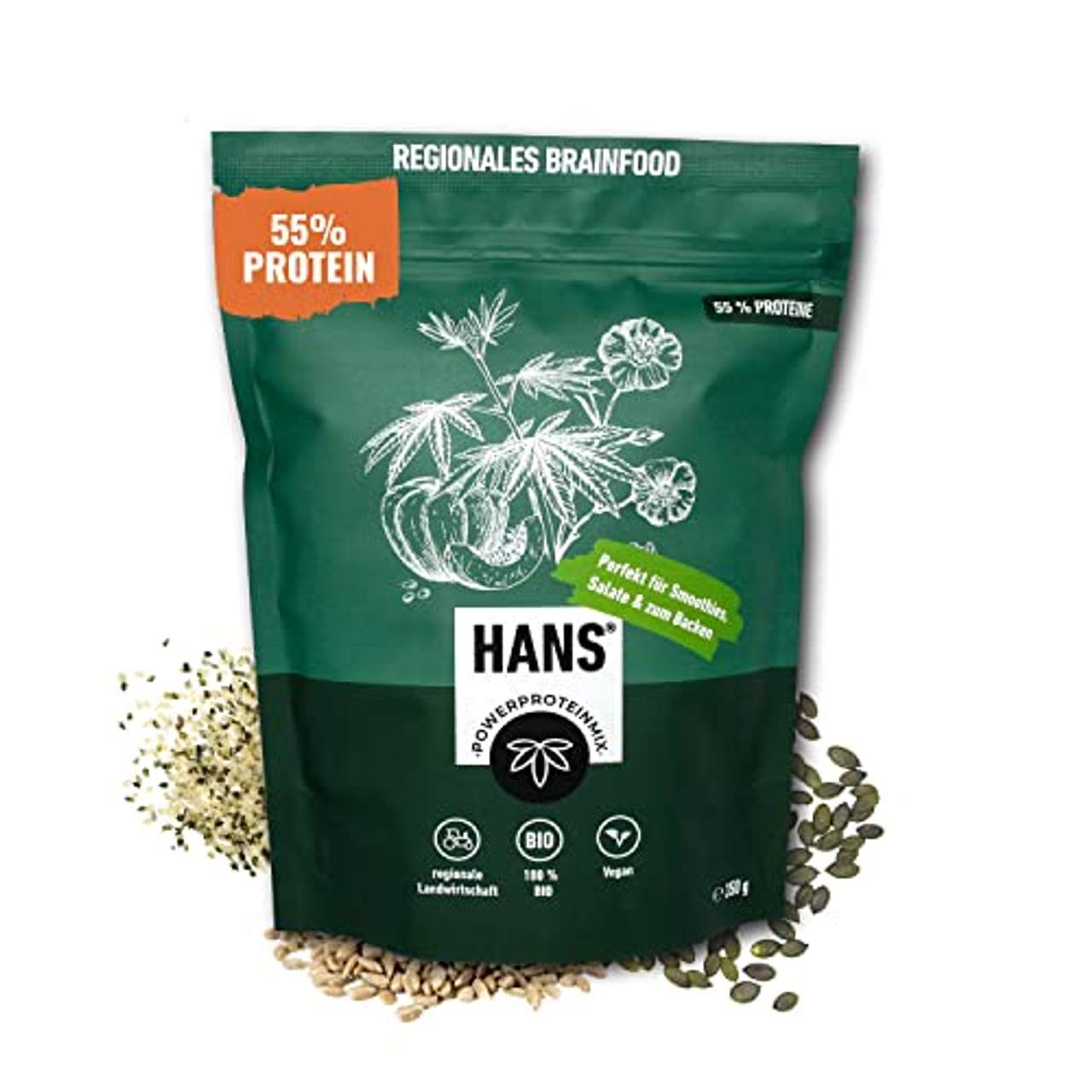 HANS Vegan Proteinpulver 55% Eiweiß ist ein Hanfproteinpulver von der Marke HANS. Es ist eine Mischung aus Hanf, geröstetem Kürbis, Flachs und Sonnenblumen. Das Produkt ist glutenfrei, laktosefrei, enthält alle essentiellen Aminosäuren und ist frei von Konservierungsstoffen und Zusatzstoffen. Es ist zu 100 % biologisch und wird aus Bayern bezogen. Dazu gibt es ein E-Book mit Rezepten für gesunde Snacks und Desserts. Es ist für Menschen jeden Alters geeignet, die sich ausgewogen ernähren und geistig fit bleiben wollen.