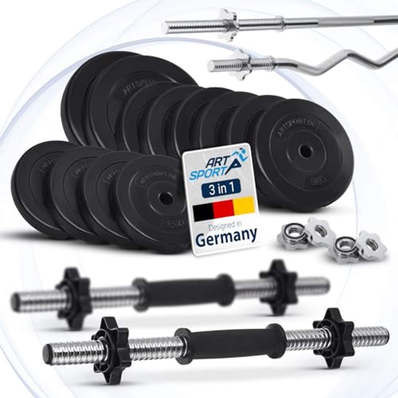 ArtSport 3in1 Hantelset mit 2 KurzhantelnDas ArtSport 3 in 1 Hantelset aus Kurzhanteln, Lang- und Curlhantel sowie Gewichtsscheiben darf in keinem Fitnessraum zu Hause fehlen. Mit diesem Set stärken Sie effektiv nahezu alle Muskelgruppen. Fördern Sie durch abwechslungsreiche Sporteinheiten für den Ober- und Unterkörper die Muskeldefinition.Passen Sie durch verschiedene Gewichte einfach die Trainingsintensität an. Das Hantelset eignet sich optimal für Frauen und Männer und rüstet Sie bestens für ein intensives Fitnessworkout. Produktmerkmale: Kurzhantelset 3 in 1 für Krafttraining 12 Gewichtsscheiben in 3 Gewichtsklassen Langhantel- und Curlstange für mehr Trainingsvarianz Rutschfeste Griffe und Sternverschlüsse Effizienter Muskelaufbau zuhause Steigern Sie Ihre Fitness: Mit drei Gewichtsklassen Zu dem Komplettset gehören 12 Gewichtsscheiben in drei verschiedenen Gewichtsklassen. Variieren Sie die Trainingsintensität durch die 2,5 kg, 5 kg, 10 kg schweren Scheiben individuell. So steigern Sie mithilfe neuer Trainingsreize
