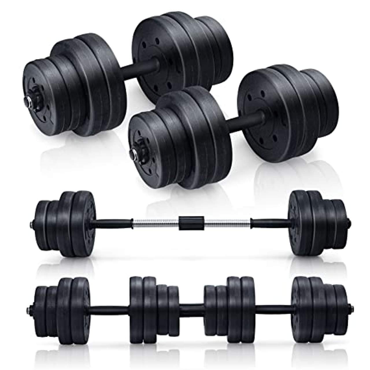 Dieses 2-in-1-Hantelset von GYMAX wiegt 30 kg und kann sowohl als Kurz- als auch als Langhantel verwendet werden. Es ist für Anfänger und Profis geeignet und besteht aus hochwertigem Eisen mit ungiftigen Polyethylen-Hantelscheiben, die sicher an den Stangen befestigt sind. Sie können die Trainingsintensität durch die Verwendung verschiedener Anzahlen und Gewichte von Gewichtsscheiben einstellen und sie eignet sich sowohl für die Fitness zu Hause als auch für den Transport in ein Fitnessstudio oder eine Trainingshalle. Die vier wichtigsten Merkmale dieses Produkts sind seine 2-in-1-Fähigkeit, die einstellbare Intensität, die Verwendung hochwertiger Materialien und die sichere Verbindung.
