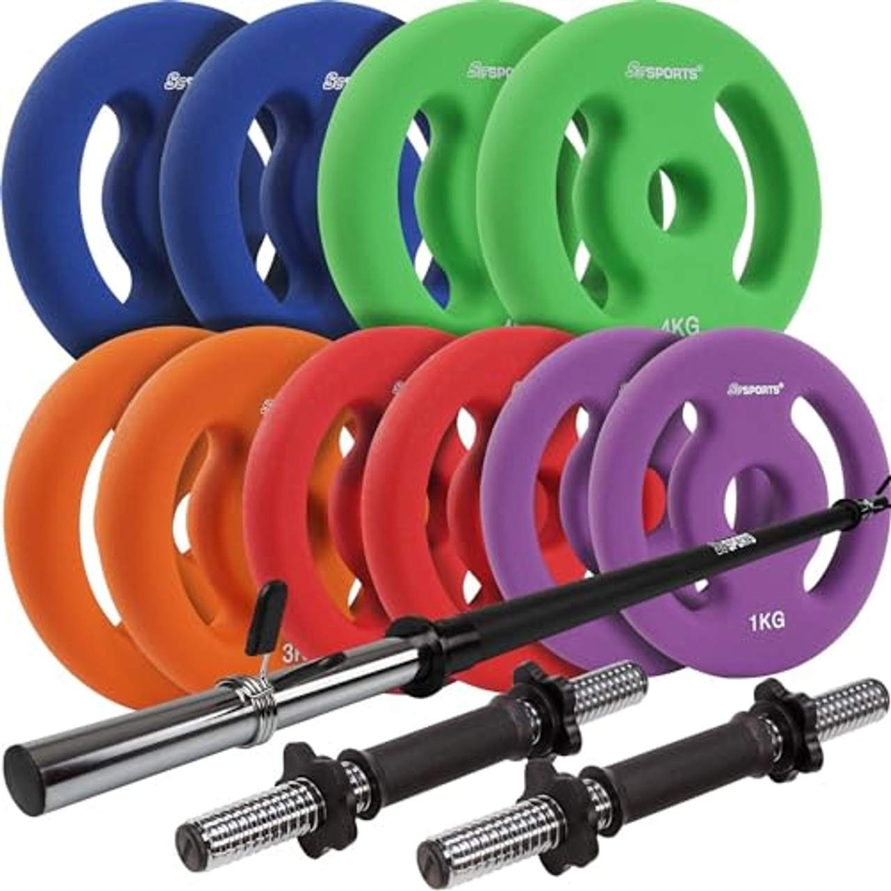 ScSPORTS 33 kg Neopren Hantelset33 kg Hantelset mit Langhantel, zwei Kurzhanteln und Neopren Hantelscheiben Langhantelstange mit zwei Kurzhantelstangen und Gewichten mit Neoprenüberzug Grundausstattung für´s Fitness- und Krafttraining Das Hantelset ist ein Basic für Dein Fitness- und Krafttraining. Du kannst das Hantelset individuell an Dein Workout zu Hause anpassen. Langhantelstange mit Schaumstoffgriff Die Schaumstoff Ummantelung sorgt für einen angenehmen und sicheren Griff und ermöglicht ein schonendes Training mit hohem Komfort.Bodenschonende und geräuscharme Neopren Hantelscheiben Die Hantelscheiben sind dank der Ummantelung besonders für ein Workout im heimischen Trainingsraum geeignet. Diese Scheiben erzeugen im Vergleich zu normalen Hantelscheiben deutlich weniger Lärm und schützen vor Kratzern. 30/31 mm Lochdurchmesser Mit der 30/31 mm Bohrung passen die Hantelscheiben ideal auf alle gängigen Hantelstangen mit 30 mm Durchmesser. Auf einen Blick: 1 x Langhantelstange 140 cm 2 x Kurzhantelstange 35 cm 2 x 1 kg Hantelscheiben Lila 2 x 2 kg Hantelscheiben Rot 2 x 3 kg Gewichte Orange 2 x 4 kg Gewichte Grün 2 x 5 kg Gewichte Blau Technische Daten Langhantelstange: Länge: ca. 140 cm Länge Scheibenaufnahme: ca. 22,5 cm Durchmesser Scheibenaufnahme: 30 mm Gewicht: ca. 2 kg Material: Stahl, hohl, verchromt Max. Belastbarkeit: 50 kg Technische Daten Kurzhantelstange: Länge: ca. 35 cm Länge Scheibenaufnahme: ca. 11,5 cm Durchmesser Scheibenaufnahme: 30 mm Gewicht: ca. 0,5 kg Material: Stahl, hohl, verchromt Max. Belastbarkeit: 50 kg Technische Daten Hantelscheiben: Material: Gusseisen mit Neoprenüberzug Bohrung: 30/31 mm 1 kg Hantelscheiben: Durchmesser: ca. 15 cm, Stärke: ca. 1,7 cm 2 kg Hantelscheiben: Durchmesser: ca. 16,5 cm, Stärke: ca. 2,5 cm 3 kg Hantelscheiben: Durchmesser: ca. 18 cm, Stärke: ca. 3 cm 4 kg Hantelscheiben: Durchmesser: ca. 19 cm, Stärke: ca. 3,2 cm 5 kg Hantelscheiben: Durchmesser: ca. 20,5 cm, Stärke: ca. 3,5 cm
