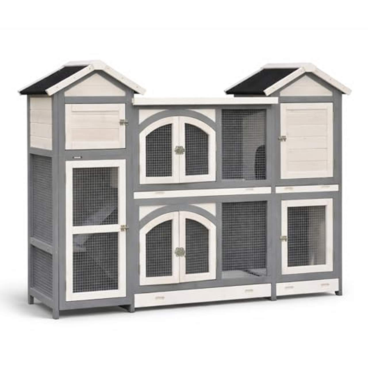 - Vielfältiges Layout: Das Produkt ist mit zwei seitlichen Türmen und einem Staufach für Futter und Zubehör intelligent gestaltet und bietet vielfältige Gestaltungsmöglichkeiten, um den Bedürfnissen des Kaninchens gerecht zu werden.