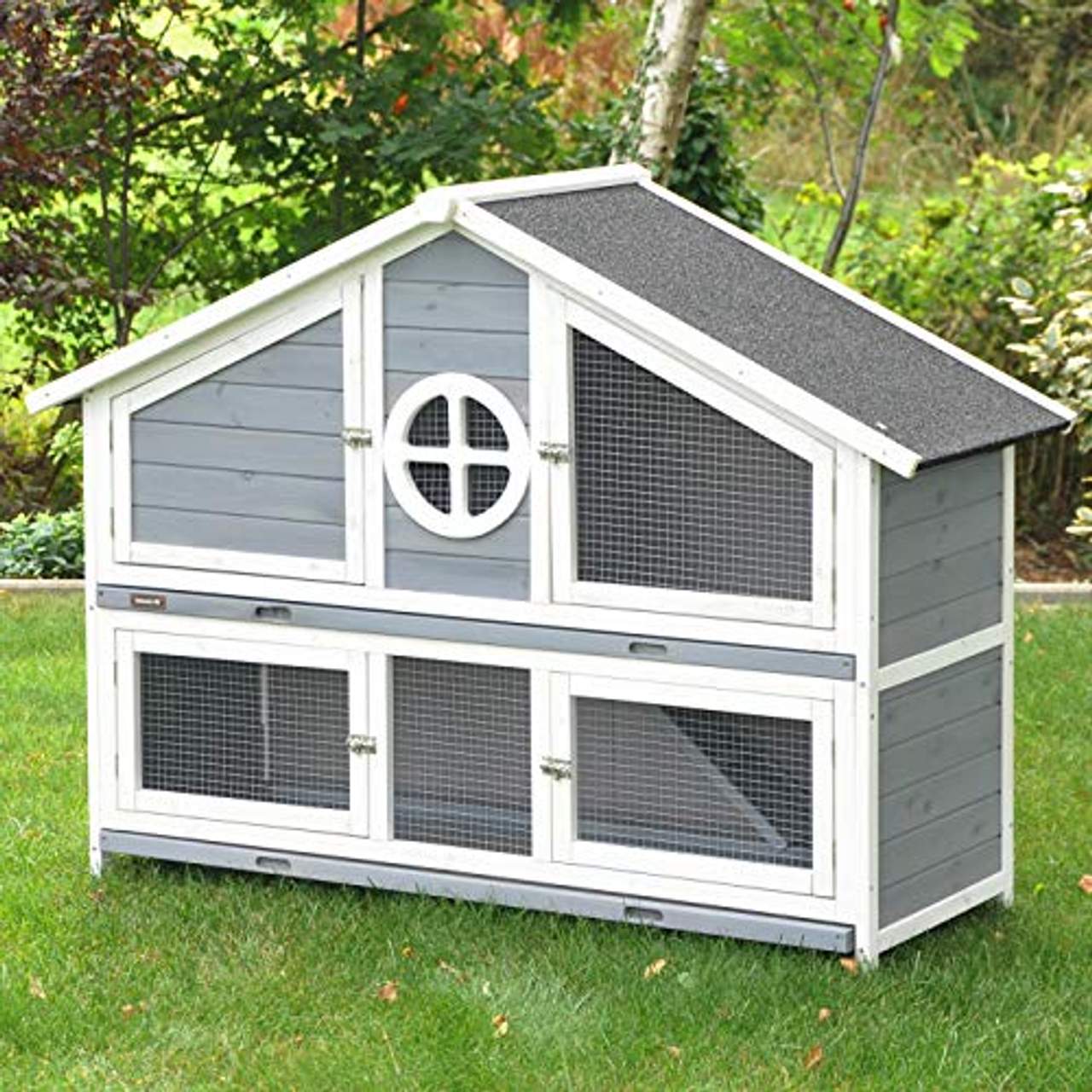 Das grau-weiße Farbschema verleiht dem Kaninchenstall einen modernen Look, der wunderbar zu verschiedenen Außenbereichen passt. Er ist nicht nur eine praktische Lösung für die Unterbringung deiner Haustiere, sondern verleiht deinem Garten oder deiner Terrasse auch einen stilvollen Touch.