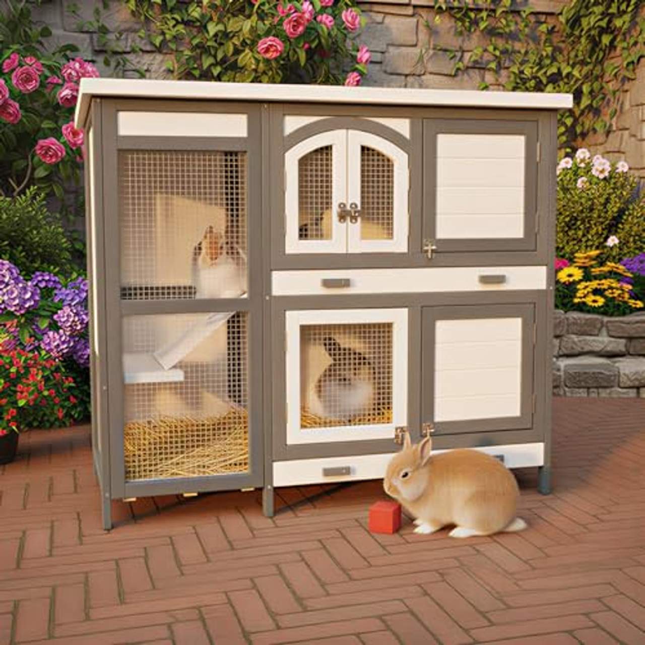 - Einfache Reinigung: Die zwei großen xxl-Kotschubladen machen es leicht, die geräumige Kaninchenvilla/das Kaninchengehege für draußen zu reinigen. Außerdem ermöglicht das zu öffnende Dach der Holzhütte einen einfachen Zugang zur oberen Etage bei der Reinigung.