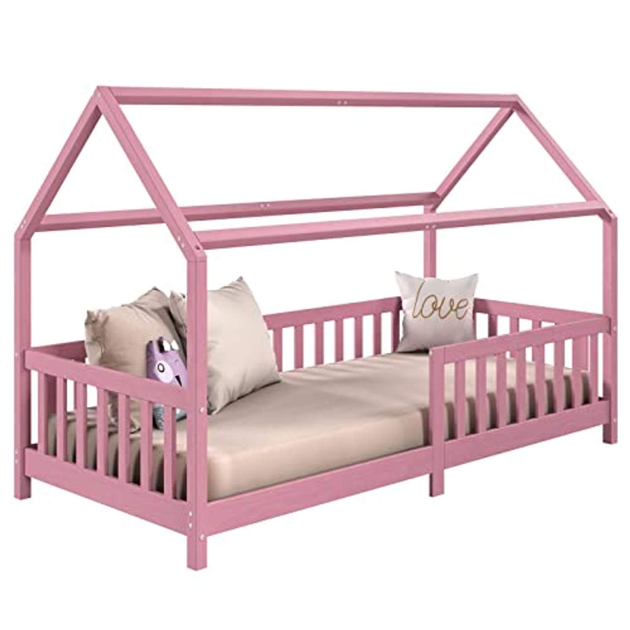 - Umweltverträgliche Materialien: Hergestellt aus massivem Kiefernholz, das mit schadstoffarmen und lösungsmittelfreien Farben in Rosa gestrichen wurde, unterstreicht dieses Hausbett die Verantwortung für die Umwelt und gewährleistet gleichzeitig die Sicherheit deines Kindes. Die natürliche Maserung des Holzes bleibt sichtbar, was einen ästhetischen Wert darstellt und gleichzeitig nachhaltig ist. Eltern können sich mit gutem Gewissen für dieses Produkt entscheiden, denn es ist umweltfreundlich und bietet eine sichere Schlafumgebung, die frei von schädlichen Chemikalien ist.