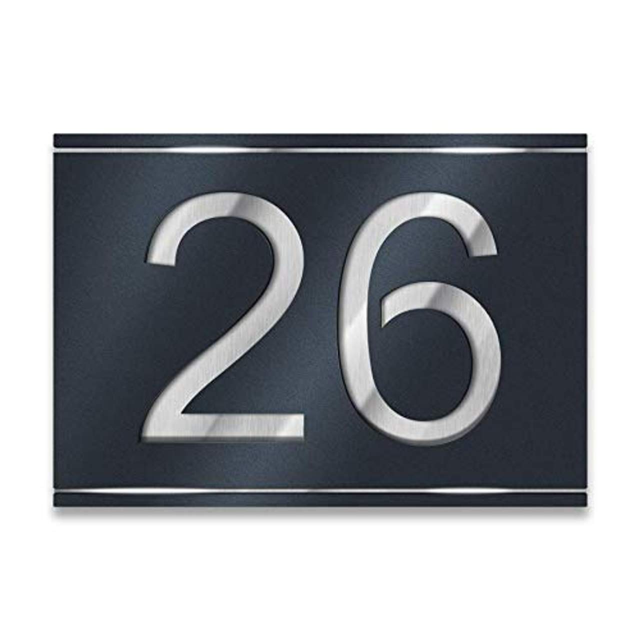 Metzler Hausnummer aus EdelstahlMetzler Hausnummer aus Edelstahl - Anthrazit (RAL 7016) / Schwarz / Weiß - Hausnummernschild - Größe wählbar Hausnummern-Schild für Ihren Eingangsbereich aus rostfreiem Edelstahl & Spezial-Acrylglas in wählbarer Farbe. Individuell mit Ihrer Hausnummer, Größen wählbar: (BxH): 160 x 110mm | 215 x 150mm | 250 x 175mm | 380 x 266mm. Optimaler Kontrast zu Ihrer Hauswand durch wählbare Farbe der Frontplatte. Befestigungsmaterial frei wählbar (Silikonkleber oder unsichtbare Steckdübel). Präzise ausgelaserte Hausnummer in Ihrer Wunsch-Schriftart. Das Highlight für Ihre Fassade. Werten Sie Ihr Haus mit dem inviduellen Hausnummernschild aus Edelstahl auf.Die Hausnummer wird hochpräzise ausgelastert. So entsteht ein 3D-Effekt an Ihrer Hauswand. Wählen Sie die für Sie passende Größe, Farbe und Schriftart, um Ihr individuelles Hausschild zu gestalten. Die komplette Herstellung der Huasnummer erfolgt in Deutschland.