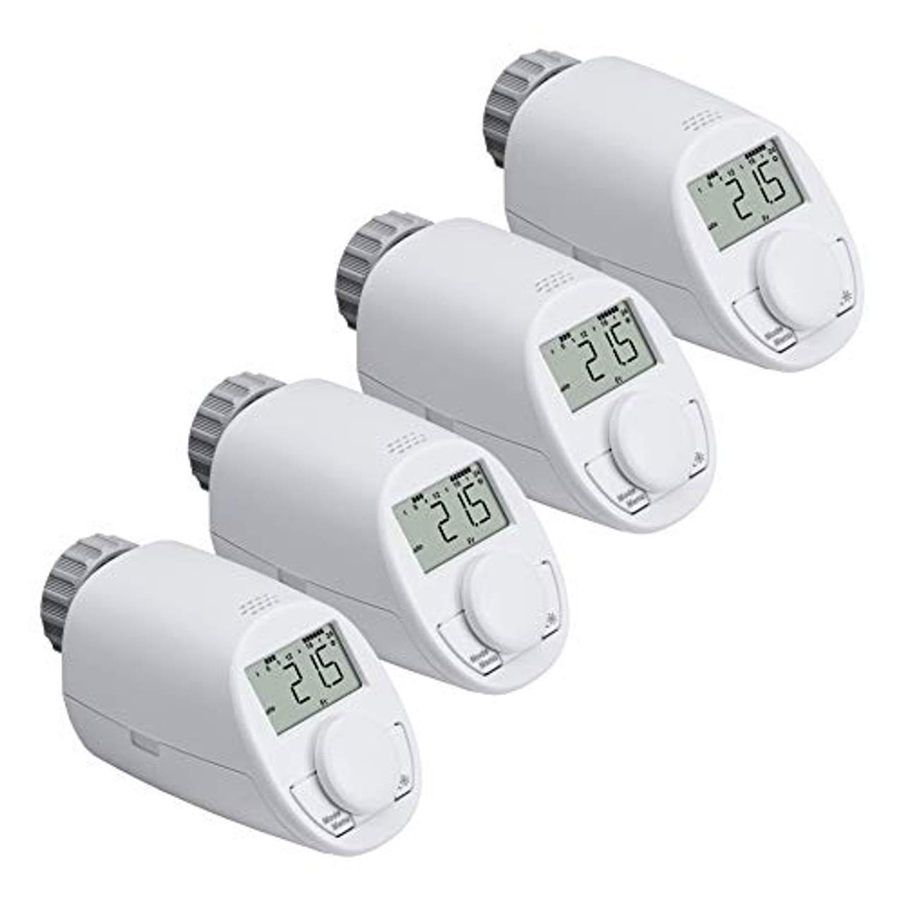 eQ-3 Heizkörperthermostat Modell NHeizkörperthermostat, Set für 4 RäumeHeizen wird immer teurer. Schonen Sie Ihren Geldbeutel und die Umwelt! Die automatische Regulierung der Raumtemperatur senkt den Energieverbrauch um bis zu 30 Prozent und ist kinderleicht zu montieren.Tauschen Sie in Minutenschnelle Ihren veralteten mechanischen Heizungsthermostat gegen diesen modernen Elektronik-Thermostat und schon können Sie genau nach Ihrem Bedarf heizen, nämlich nur dann, wenn Sie wirklich einen warmen Raum benötigen, und genau so warm, wie Sie es wünschen!-Zeitgesteuertes Regulieren der Raumtemperatur