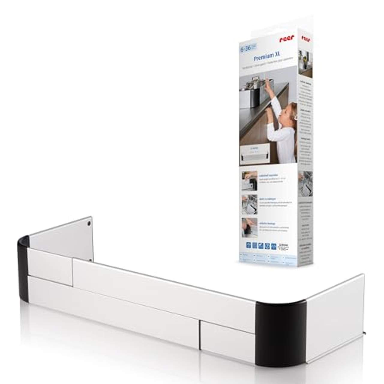Reer Herdschutzgitter Premium XLDer Herdschutz Basic von Reer setzt auf ein raffiniertes Stecksystem. Er wird ohne Bohren und Schrauben befestigt und kann in der Länge verstellt werden. Herdschutz Basic von Reer Stecksystem, Klebeschienen ausziehbare Länge: 57 bis 90 cm, Höhe 12 cm geeignet für Elektro-, Induktions- und Gasherde, geeignet für alle Arbeitsplatten doppelwandiges Aluminium, Kunststoff Mit dem Herdschutz von Reer bleiben heiße Töpfe und Pfannen zuverlässig an ihrem Platz.Das Accessoire wird einfach über Klebeschienen am Kochfeld der Küche befestigt. Die Länge ist variabel und kann zwischen 57 und 90 Zentimetern individuell festgelegt werden. Seitenflügel sorgen dafür, dass neugierige Hände nicht ohne Weiteres um die Umrandung herumgreifen können.Praktisch: Das aus doppelwandigem Alumium gefertigte Accessoire kann im oberen Fach der Spülmaschine gereinigt werden. Wird der Herdschutz nicht mehr benötigt, lassen sich die Schienen rückstandslos entfernen.