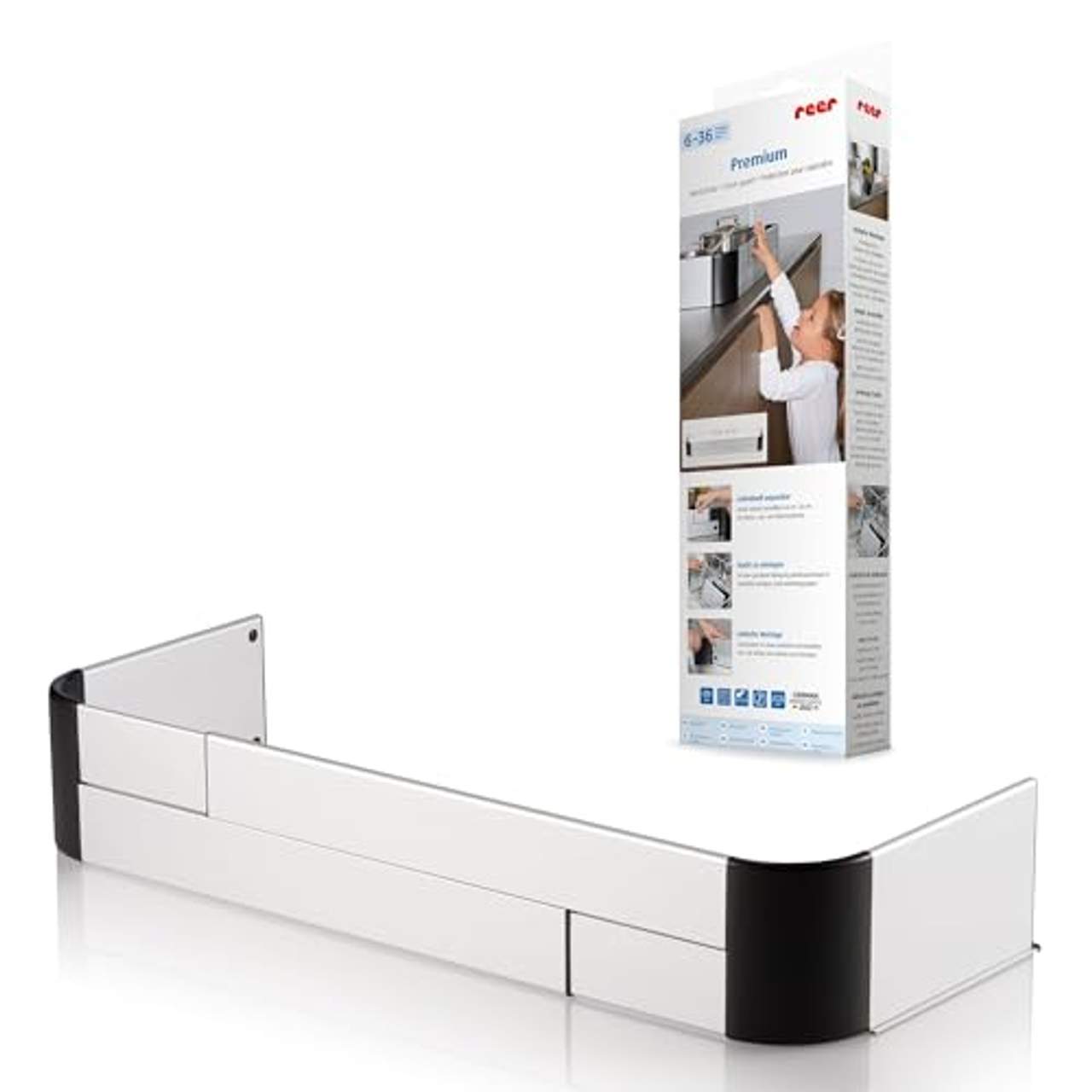 reer Herdschutzgitter Premium zum KlebenVerbrennungen und Verbrühungen gehören zu den häufigsten Unfällen bei Kleinkindern: 80% dieser Unfälle passieren am Herd. Ein Herdschutzgitter schützt Kinder vor dieser Gefahr und verhindert zuverlässig, dass sie an Herdplatten oder heiße Töpfe gelangen.- zur Absicherung heißer Herdplatten und Kochstellen- für Elektro-, Gas- und Induktionsherde- geeignet für alle Arbeitsplatten- Breite variabel verstellbar von 44-65cm- einfache und sichere Befestigung dank des speziell entwickelten Klebebandes, Montage ohne Bohren und Schrauben- Stecksystem für einen einfachen und schnellen Auf- und Abbau- elegante Formgebung bei hoher Funktionalität- leicht zu reinigen, spülmaschinengeeignet (im oberen Fach)Material: eloxiertes Aluminium und hitzebeständiger KunststoffDer Herdschutz muss gemäß der Anleitung fest an der Arbeitsplatte montiert werden, nur so kann er das Kochfeld sicher begrenzen!Hersteller-Artikelnummer: 20068