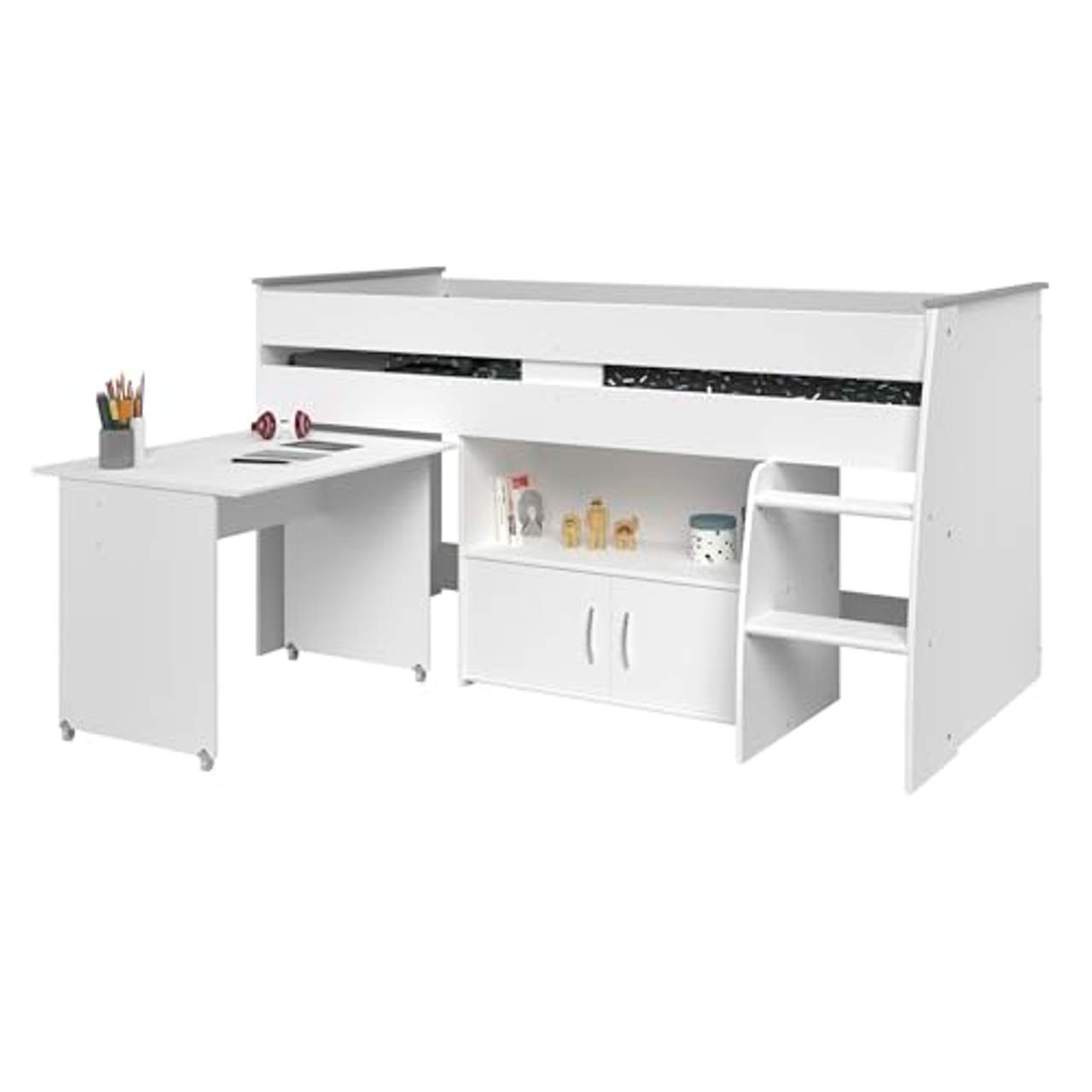 Das Parisot 2270 Hochbett bietet verschiedene Merkmale, die sowohl zu seiner Funktionalität als auch zu seiner Ästhetik beitragen. Dazu gehören ein ausziehbarer Schreibtisch, der bei Bedarf zusätzlichen Arbeitsraum bietet, eine integrierte Leiter auf der rechten Seite, die einen einfachen Zugang zum erhöhten Schlafbereich ermöglicht, Staufächer für eine bequeme Organisation sowie ein offenes Fach und eine Kommode, in denen man seine Sachen ordentlich aufbewahren kann. Seine moderne Ästhetik wird durch den weißen Korpus, die grauen Griffe, die belüftete Einlegeplatte auf der Liegefläche und die Metallscharniere unterstrichen.