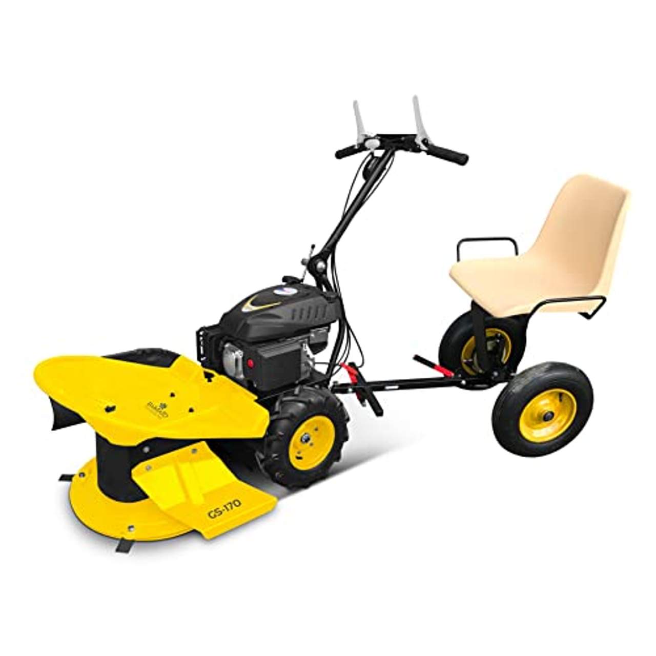 BAMATO Hochgrasschneider Kreiselmäher GS-170Der Hochgrasmäher GS-170 ist mit einem kraftvollen RATO R225 Motor ausgestattet und eignet sich deshalb optimal zum Mähen von hohen Rasenbeständen, Unkraut oder Gestrüpp.Im Vergleich zum herkömmlichen Balkenmäher gibt es bei einem Hochgrasmäher KEIN verstopfen oder rupfen des Schnittgutes.Durch die 4 beweglichen Messer erhalten Sie ein sauberes Schnittbild. Bei Hindernissen wie Steinen klappen die Messer einfach nach Innen.Ausgestattet ist der GS-170 mit einem seitlichem Grasabweiser, welcher das Schnittgut seitlich auf Schwad ablegt.Beim Bedienkomfort kann der Hochgrasmäher ebenfalls durch den höhenverstellbaren Lenkholm punkten, welcher auch schnell und ohne Werkzeug für den Transport zum Beispiel ein einem Auto eingeklappt werden kann.Reifen mit Ackerprofil sorgen auch im Gelände für einfaches Handling.Der Hochgrasschneider ist ein Qualitätsprodukt Made in Europa fahrbarer Sitz:Ausgestattet mit groß dimensionierten Reifen, optimal für unwegsames GeländeEinfach und schnelle Montage am HochgrasmäherHand- und Fußbremse sorgen für zusätzlichen KomfortQualitätsprodukt Made in Europa