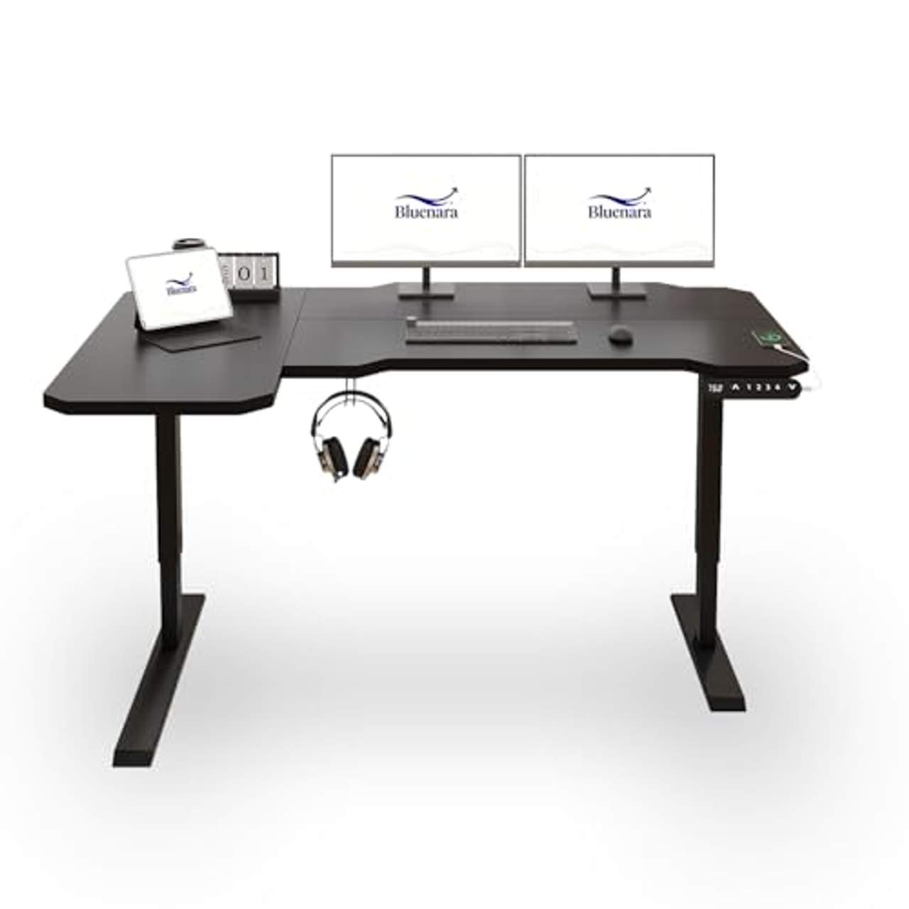 Der Bluenara Schreibtisch Höhenverstellbar Elektrisch ist ein ergonomischer Schreibtisch für das Homeoffice, der ein gesundes Arbeitsumfeld für selbstständig und mobil arbeitende Menschen fördert. Er bietet reichlich Platz für Arbeitszubehör wie Laptops, Monitore und Schreibwaren. Mit seinem L-förmigen Eckdesign und den abgerundeten Ecken spart er Platz und schützt deine Familie vor möglichen Quetschungen.